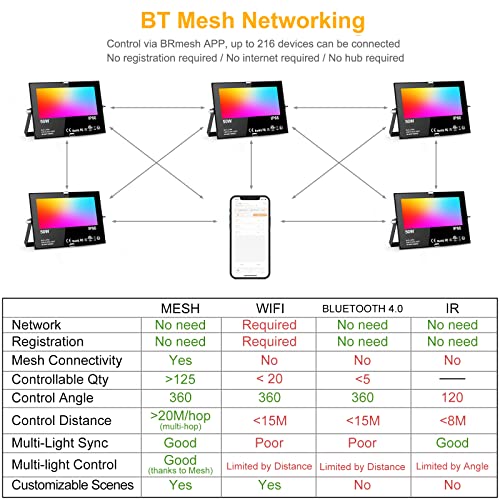 This is a Bluetooth connected APP control color changing led flood light( No remote controller,only can be controlled by APP). "Control at your will", ”DIY Scenes“ and ”Timing“ are just three of its many unique functions. How to get started with Taptoron Bluetooth rgb flood light needed APP control. 1, Scan the QR code on the manual to download the "BRmesh" APP from Google Play or IOS APP Store. 2, Open '' BRmesh'' APP, and click the ''+ '' in the upper right corner of the APP to add lights ( light don't need pair with your phone's Bluetooth). 3, Follow the ''Add guideline'' to add lights. Check '' I have understood'' , and click '' Enter to add'' then immediately turn on the lights. 4, Then light and APP will connect automatically, then click ''Finish'' then you can change color/mode, set timing or music sync. Features: Registration: Not Required Maximum Number of Devices: 125 Dimmable: Yes (via APP only) Timing: Yes DIY Scenes: Yes DIY Flash mode: Yes DIY Fade mode : Yes Device Sharing: Yes MESH : Yes Color Changing: Yes Memory Function: Yes Modes: 21 system preset dynamic mode+ DIY Flash and DIY fade mode Sync: Yes 16 million colors: Control Red, Green, Blue Colors Independently From Each Other With Pin Point Accuracy! Individual Color RGB Adjustment 0 - 255. Color Change Sync to Music: change colors according to rhythm of music melody. Within 16 million colors and 23 modes, it is perfect to use for stage lights, landscape lighting, backdrop lighting or bar, party. DIY Flash and DIY fade: In addition to 21 kinds of system preset dynamic mode, BRmesh APP also added DIY Flash and DIY fade mode, you can customize the flashing/fade color, sequence, and speed, up to 7 different colors flashing/ fade, 5 levels of flash/fade speed adjustment. Suitable for video taking and photo shooting: Any color will not cause strobe to the screen of the mobile phone. Specifications: Input: 85-265V Universal Power: 50W Lumens: 5000LM (500W equivalent) Color Temperature: 5700K CRI: >85 Color : 16 million rgb colors Beam Angle: 120° Cable Length: 2 Meters Waterproof Rating: IP66 (do not immerse it in water) Package Contents: 50W LED flood light outdoor x 4 User Manual x 4