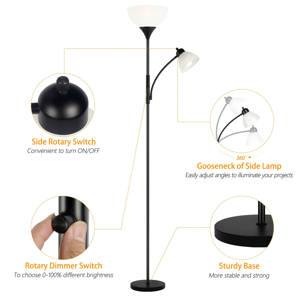 Q: How do I control the brightness of the Floor Lamp?A: The Floor Lamp features a stepless dimming rotary switch for the main lamp, allowing you to adjust the brightness from 0-100%. The side lamp has a separate rotary switch for simple ON/OFF control.