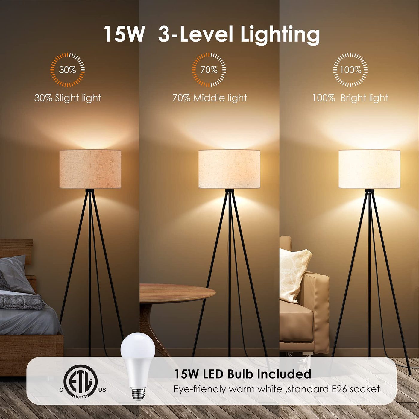 Floor Lamp For Living Room, Tripod Floor Lamp, 15W Led Bulb, 3 Levels Dimmable Brightness, Linen Lamp Shade, Mid Century Standin