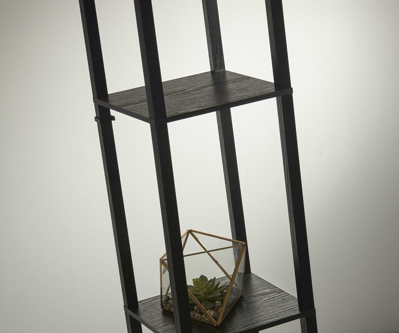 Have it all with high style and multi-function. This shelf floor lamp feature a black walnut wood open box frame with two additional display/storage shelves, making it a handy addition to the living/media room, den, office, or bedroom. The collapsible poly/cotton shade diffuses light from a 150 Watt incandescent or equivalent bulb. The lamp has on/off functionality with a metal ball accented pull chain switch. This lamp has a clear cord and is smart outlet compatible. Bulb is not included.