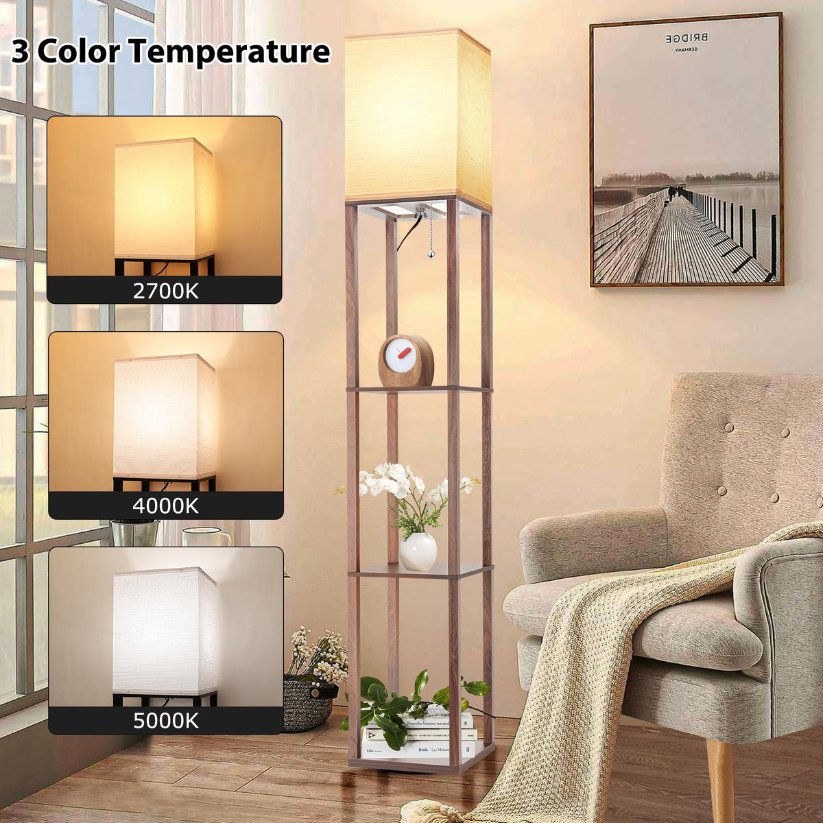 Floor Lamp With Shelves For Living Room Walnut Brown, Shelf Floor Lamp With 3 Cct Led Bulb, Corner Display Standing Column Lamp