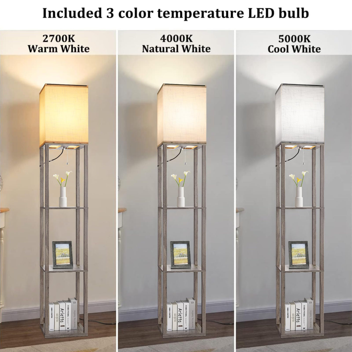 Q: What type of LED bulb does the Floor Lamp with Shelves include?A: The Floor Lamp with Shelves includes a 3 color temperature LED bulb that allows you to easily switch between 2700K, 4000K, and 5000K, providing versatility in lighting for various activities.