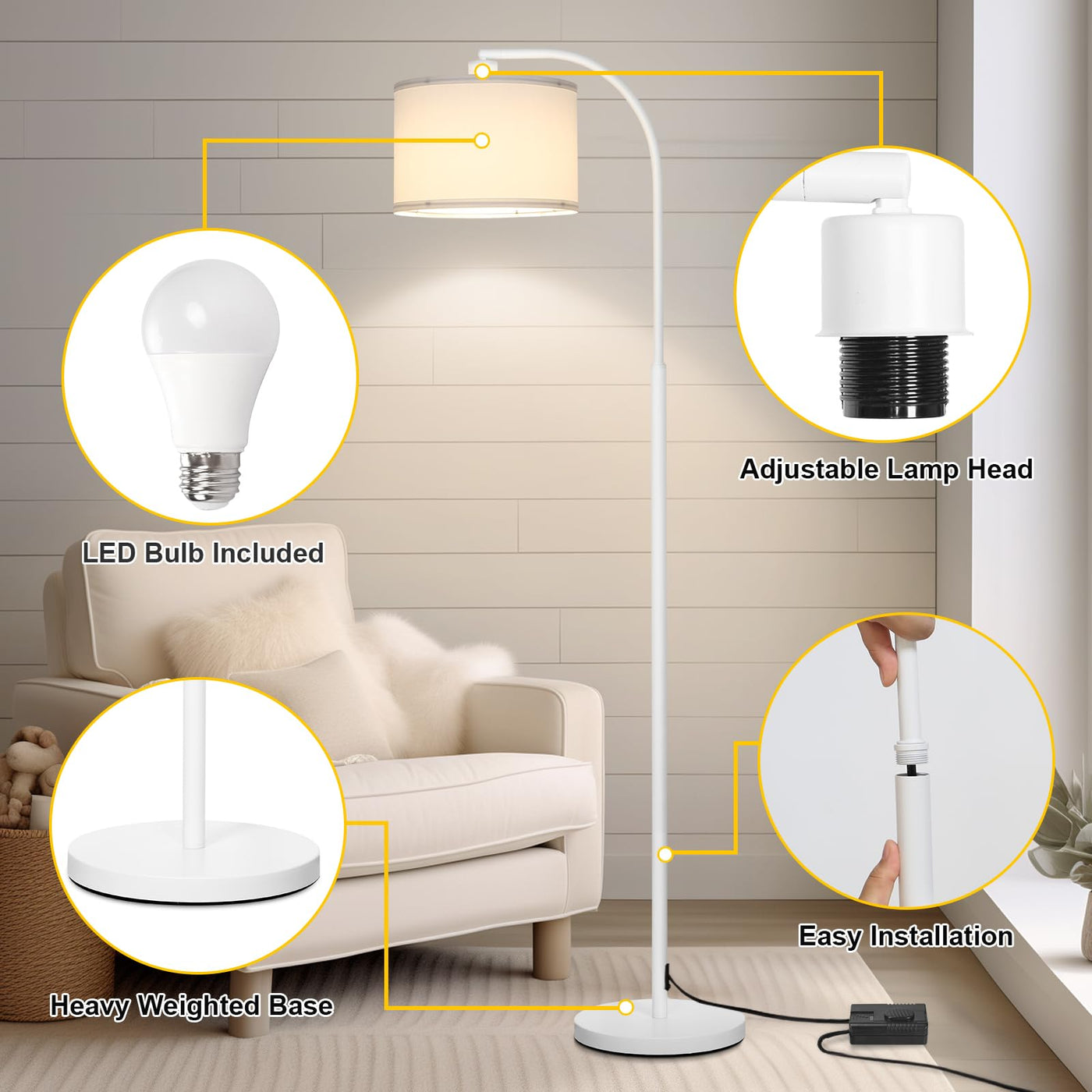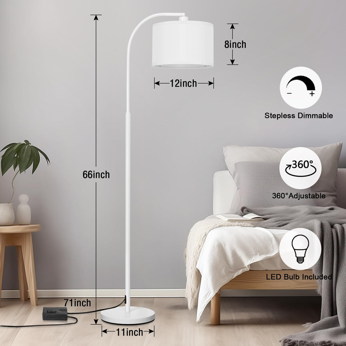 Floor Lamps For Living Room, White Arc Floor Lamp With Stepless Dimmer, Modern Standing Lamp With Adjustable Drum Shade, Tall Po