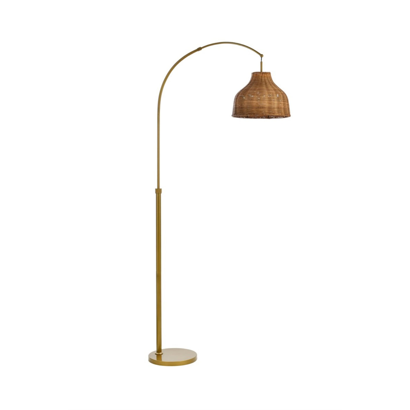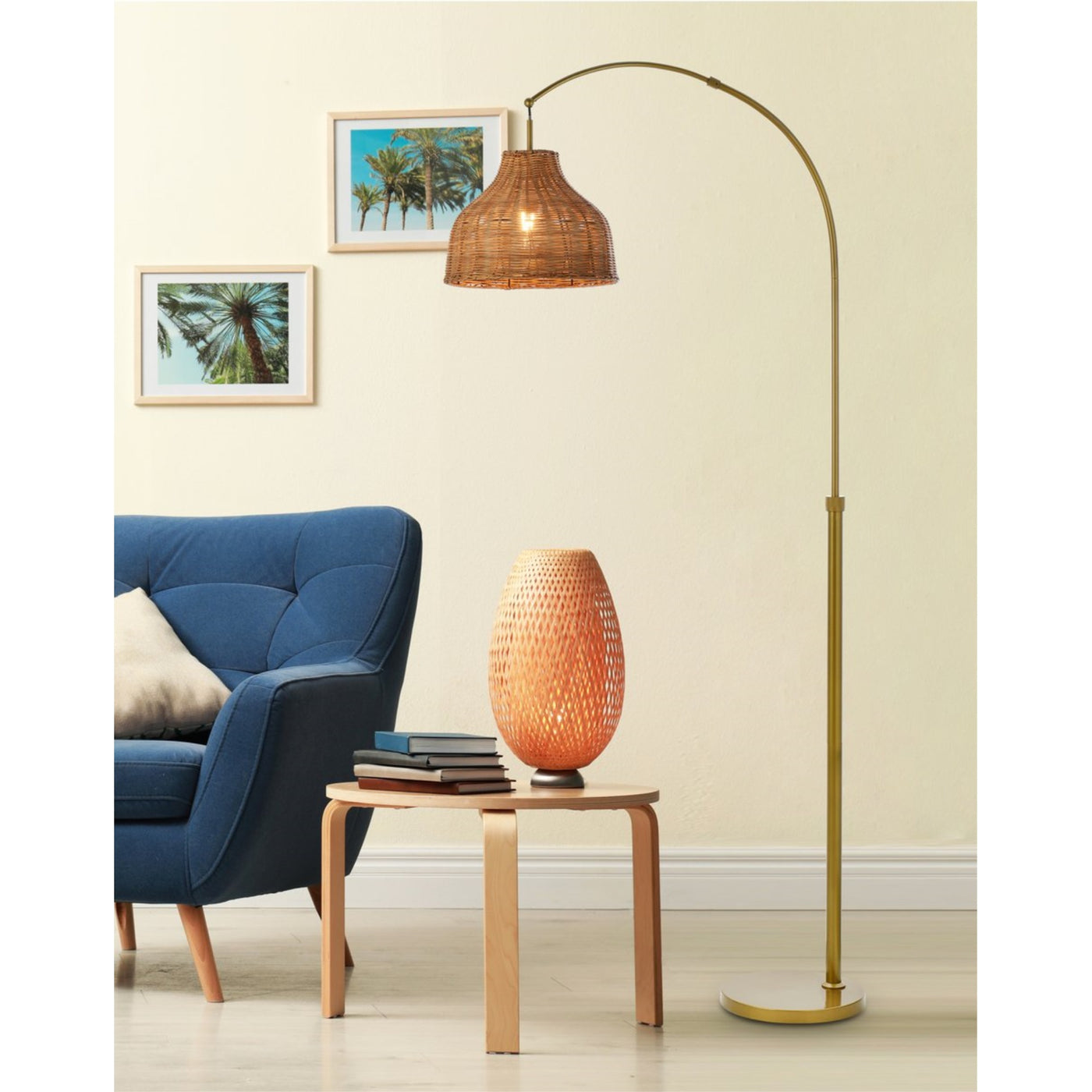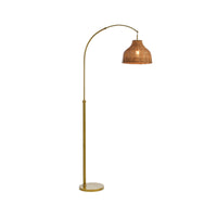 Illuminate your space in simply-chic mid-century modern style with this 75 H floor lamp. Crafted with iron and rattan in a fashionable brass finish, this lamp features a tubular column post stemming from a round pedestal base. A simple arc arm suspends one light in place, surrounded by a rattan dome shade. Powered by a 120 length of cord and operated by a simple on/off switch, this lamp accommodates one 60 W incandescent medium base bulb (not included) to cast bright light throughout your space.
