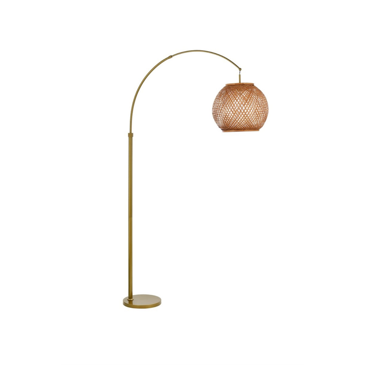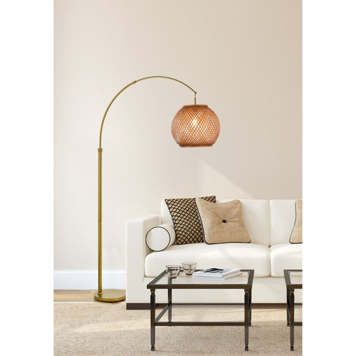 Illuminate your space in simply-chic mid-century modern style with this 77 H floor lamp. Crafted with iron and rattan in a fashionable brass finish, this lamp features a tubular column post stemming from a round pedestal base. A simple arc arm suspends one light in place, surrounded by a rattan round shade. Powered by a 120 length of cord and operated by a simple on/off switch, this lamp accommodates one 60 W incandescent medium base bulb (not included) to cast bright light throughout your space.