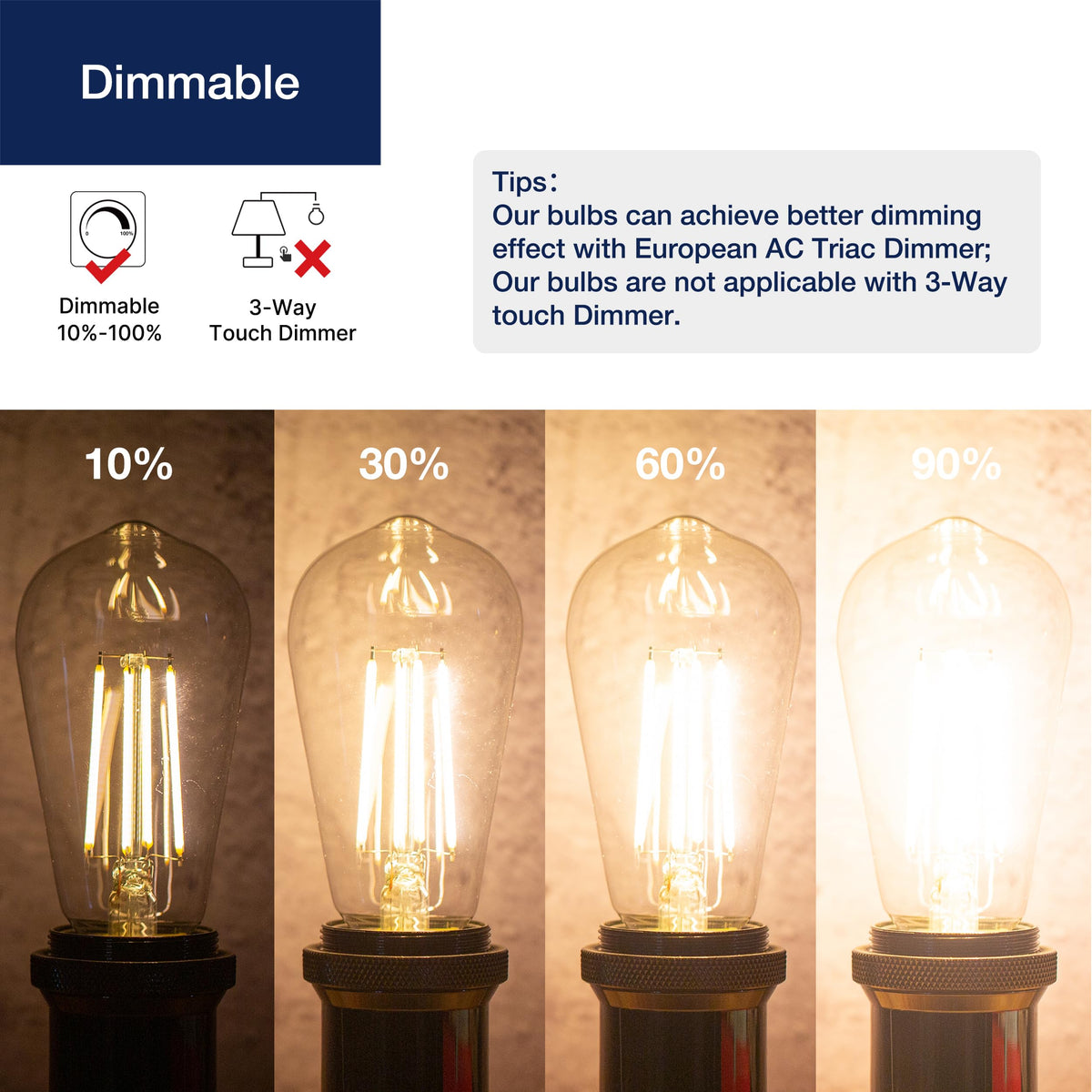 High Brightness and Energy Efficiency: Replace 100 Watts incandescent bulb by 8W LED light bulb, up to 90% less energy than traditional incandescent lamp, lasting about 15000 hours, saving energy and your cost. Low heat dispersion and high lighting efficacy | Flexible Dimming:Smooth dimming for range 10%-100%(According to your dimmer performance) brings your soft white light and provide you any brightness as your preference without flicker and buzzing. Compatible with most types of dimmers | Soft White Lighting: The LED light bulbs provide 1000 Lumens of light immediately to full brightness and perfect for general lighting. 2700K Soft White to create a comfortable atmosphere for home | Simple Installation: Just screw the light bulb into the E26 socket and secure it tightly. E26 Base for pendant light or other E26 screw base lighting fixtures. Please cut off the power before installation. Package Included: 4pcs/box | Wide Application: Indoor lighting for bathroom, living room, dining room, laundry room, kitchen, porch, warehouse, residential and commercial, workshop, hotel, offices, museum, gallery, shopping malls, restaurants and so on