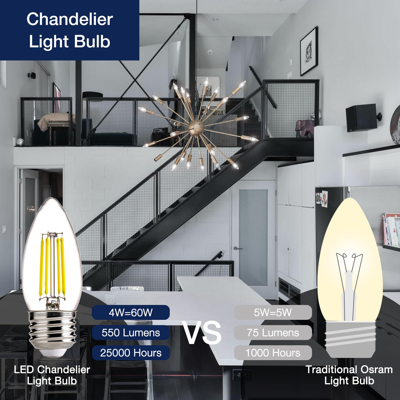 Q: What is the energy efficiency of the FLSNT B11 E26 LED Chandelier Light Bulbs?A: The FLSNT B11 E26 LED Chandelier Light Bulbs are highly energy-efficient, replacing a traditional 60-watt incandescent bulb with only 4 watts of power. This efficiency leads to significant energy savings and a longer lifespan of approximately 25,000 hours.