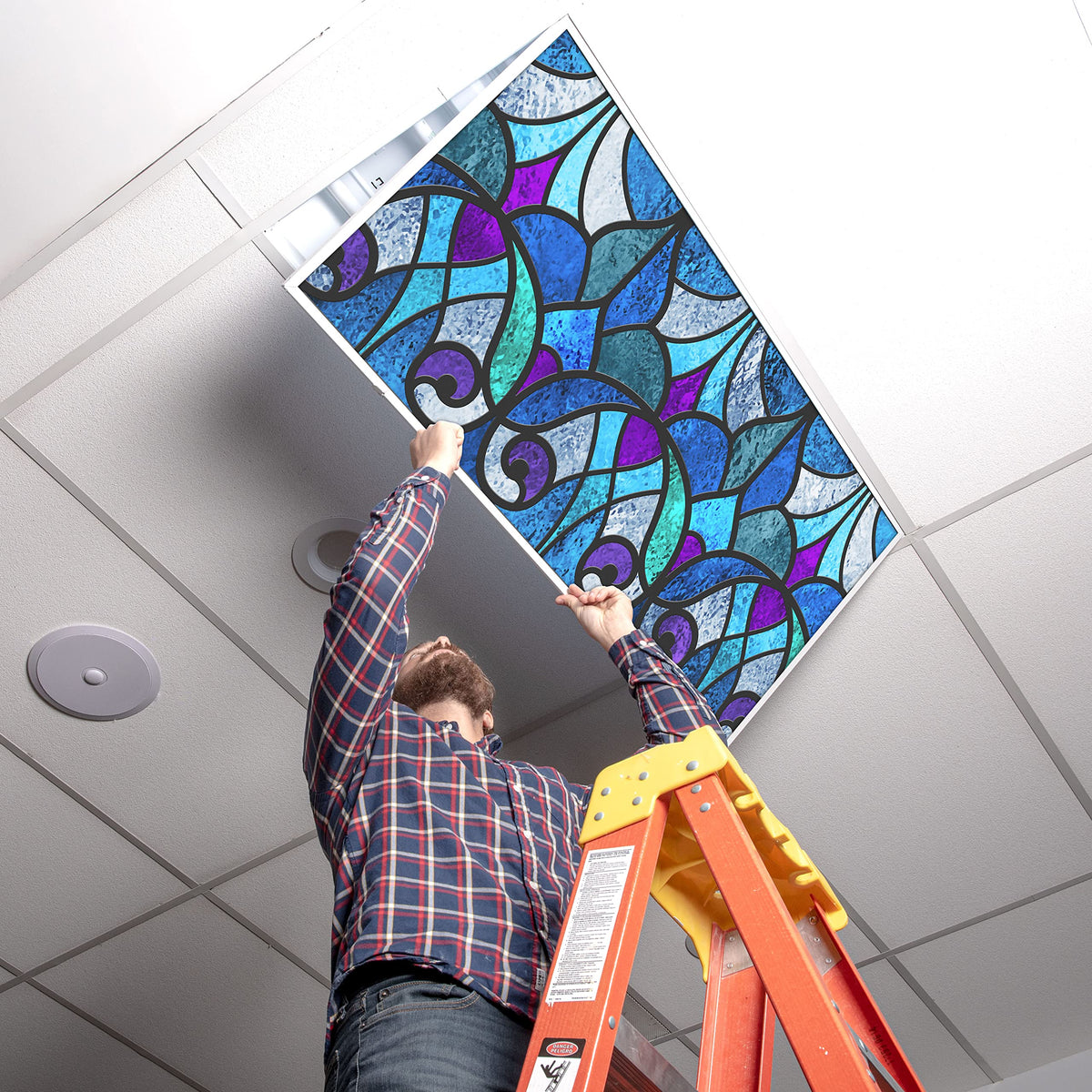 Octo Lights - Fluorescent Light Covers - Stained Glass SeriesReduce harsh fluorescent glares and escape the indoors without leaving your desk or cubicle. Whether at home, in school, or at the office, liven up any fluorescent lighting system with the Octo Lights stained glass design fluorescent light filters to transform your ceiling lights into stained glass works of art!Made with top quality materials and featuring high-resolution photo prints the Octo Lights stained glass fluorescent light covers are designed to enhance any space you choose to install. By removing the harsh glares from the fluorescent lights, your living and workspace will be transformed into one of calm and serenity.Octo Lights Features and BenefitsLightweight and FlexibleEco-FriendlySelf-Extinguishing MaterialEasy Installation and ExchangeUL CertifiedSafe for All EnvironmentsBacklit Film for Traditional Fluorescent Lighting Systems (Contact us for LED)Size: 2x4 (Contact us for 1x4, 2x2 or custom sizing)8 Stained Glass Design VariationsPerfect ForHomesClassroomsOfficesWorkshopsHospitalsAnd MoreAbout Octo LightsAs leaders of the lighting industry, we take pride in offering high quality stained glass fluorescent light covers that are easy on the pocket. Our experts use high-resolution images to develop flawless ceiling tiles. You can rest assured that youll be paying for top-notch light products in the market.