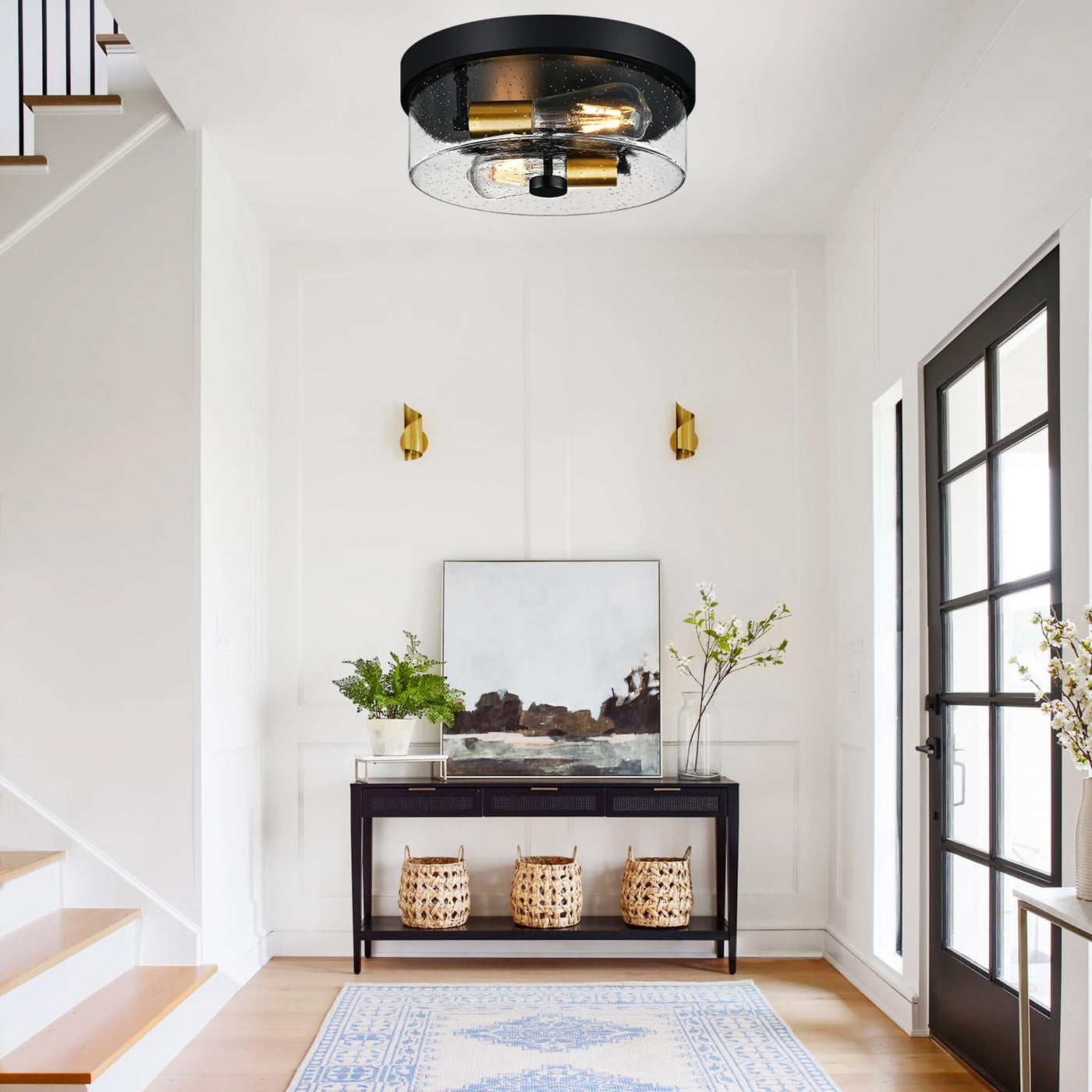 Flush Mount Ceiling Light Fixtures, 2-Light Black And Gold Ceiling Mount For Farmhouse With Seeded Glass Lampshade, Industrial F