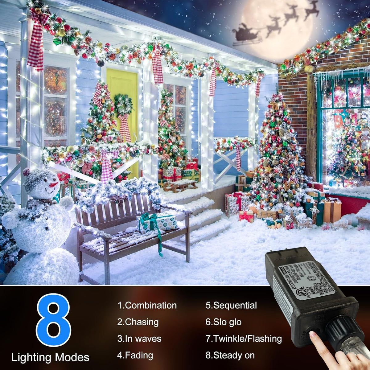Q: What are the different lighting modes available for the FLVOECN Christmas lights?A: The FLVOECN Christmas lights feature 8 different lighting modes: 1. Combination, 2. In waves, 3. Sequential, 4. Slo-glo, 5. Chasing/flash, 6. Slow fade, 7. Twinkle/flash, and 8. Steady on. This variety allows you to create a unique atmosphere for any occasion.