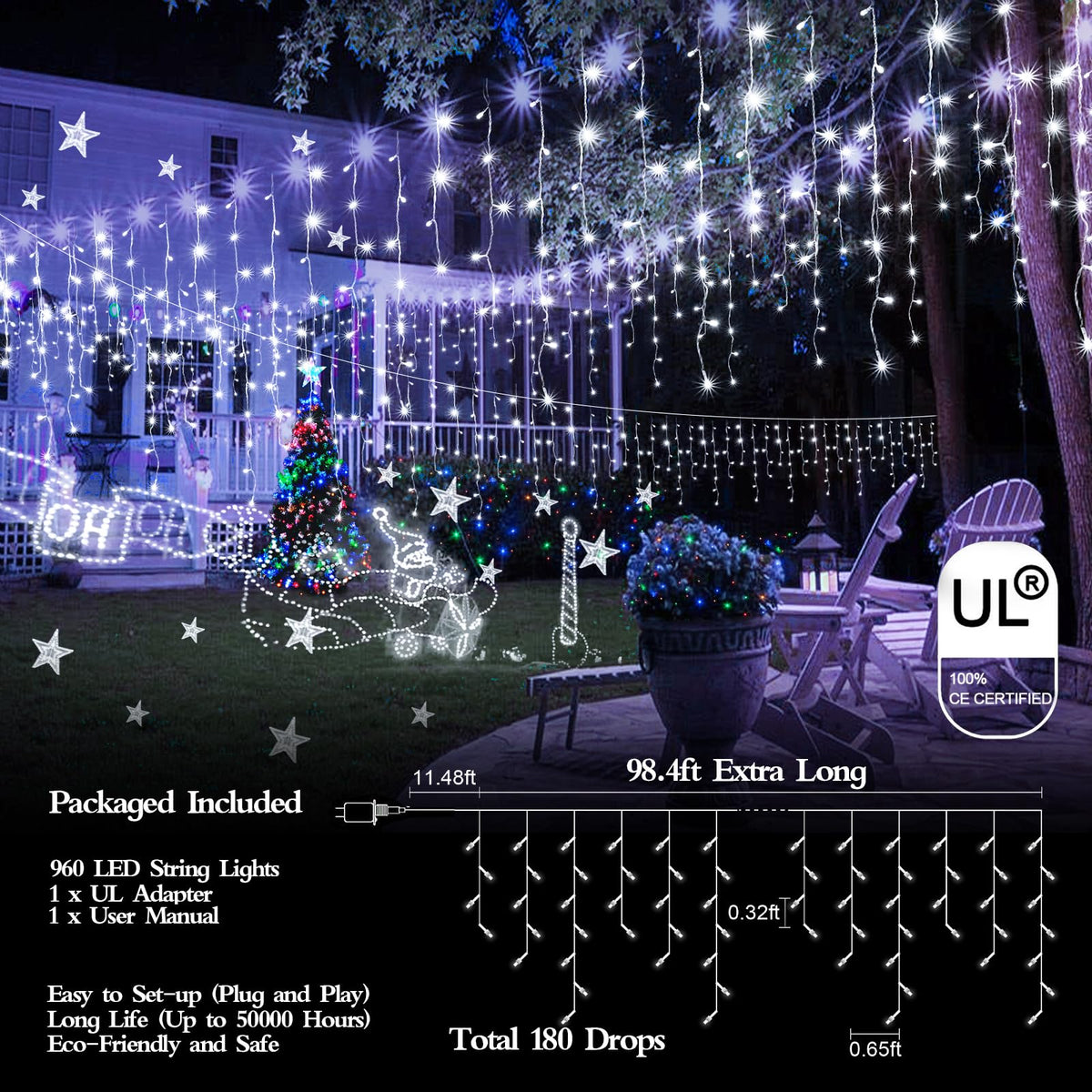 Q: What are the benefits of using LED Christmas lights compared to traditional lights?A: LED Christmas lights, such as the FLVOECN 98FT 960LED, are more energy-efficient, consuming only 6 watts and saving up to 93% energy compared to traditional incandescent lights. They also have a longer lifespan and are more durable, making them a safer and more economical choice for holiday decorations.