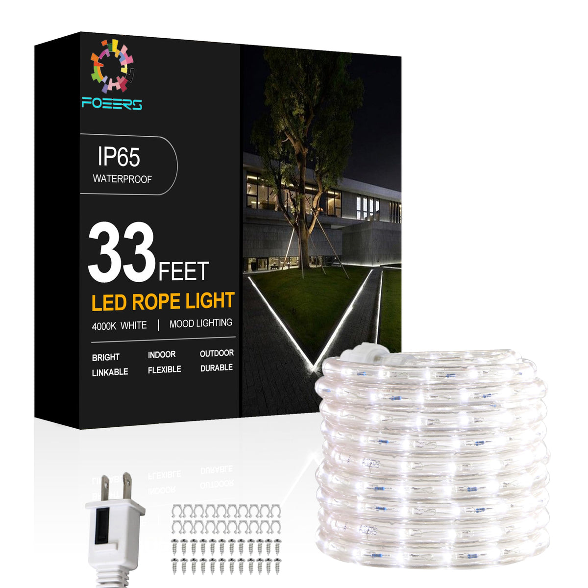 FOEERS 33FT White LED Rope Lights Outdoor,Flexible Tube Rope Lights Plug in,Connecting Rope Lights for Deck,Patio,Camping,Porch,