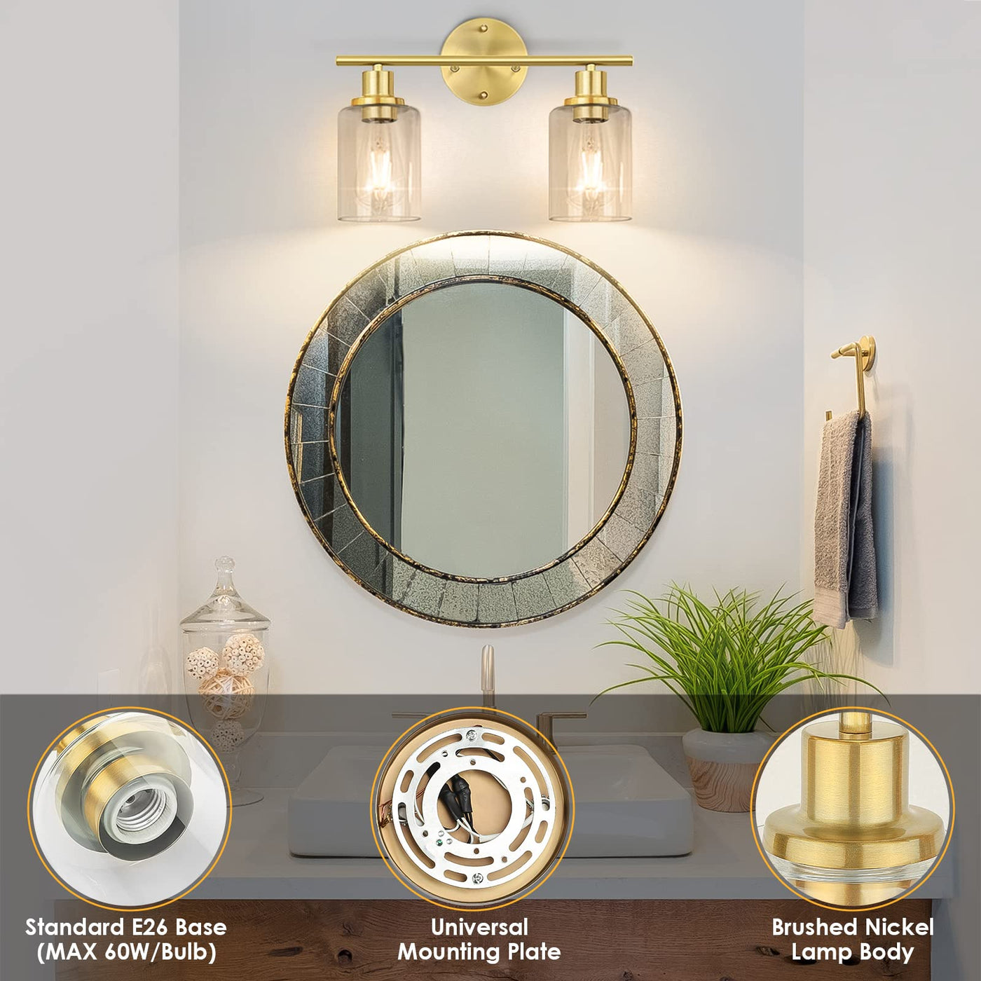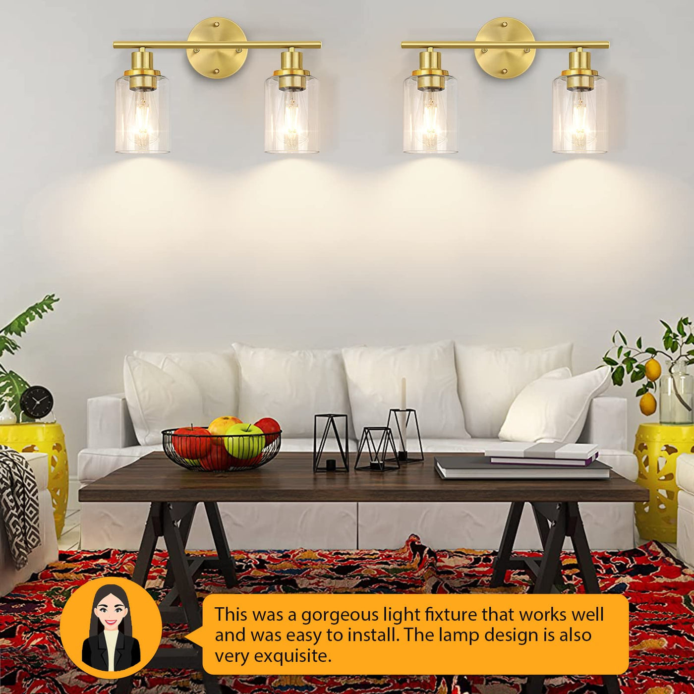 2-Light Bathroom Vanity Fixtures Industrial Gold Antique Wall Lighting Sconce for Mirror Cabinets Dressing Table Exquisite & Elegant Design - The matte Gold lighting body makes the vanity light fashionable, elegant and full of texture. With the high-transparent glass cylindrical glass shades, this vanity lighting releases transparent and generous light to your home. Durable Construction - Made of premium metal, our bathroom vanity lights provide long-term durability, which can effectively protect it from oxidation, rust and corrosion in a wet location. Wide Application - This wall light is great for your bathroom, dressing table, mirror cabinets, vanity table, art display, dining room, kitchen, bedroom, living room, powder room, and more. Installed over a vanity in the bathroom, perfectly create a warm, bright, and comfortable lighting. Standard E26 Base All the bulbs based E26 is compatible for our wall vanity light, the MAX watt is 60 for one light . You can use ST64, ST58, A19 and other medium bulbs; LED bulbs, CFL, incandescent and halogen bulbs... Voltage: 110-120V Material: Metal+Glass Lamp Base: E26 Finished: Matte Gold Power Max: MAX 60W of Each Socket(Bulb is Not included) QA: What material is the metal bracket of this vanity light made of? Is it rust-proof? Our wall sconces lighting is made of die-cast aluminum alloy with matte Gold finish. It is anti-rust and anti-corrosion, which enables it to adapt moisture damp conditions without any problem, no worries about the aging, discolor, or bent issue. Can I use this Gold bathroom light fixture with dimmable bulbs? Yes,it can works with dimmable bulbs if you have a wall dimmer switch. Is it easy to install? The wall light package includes all mounting hardware(1 x lamp metal base, 2 x glass shade, 1 x tool kits, 1 x user manual). 1.Screwing the glass shades 2.Screwing the bulbs 3.Mounting the base and wiring up