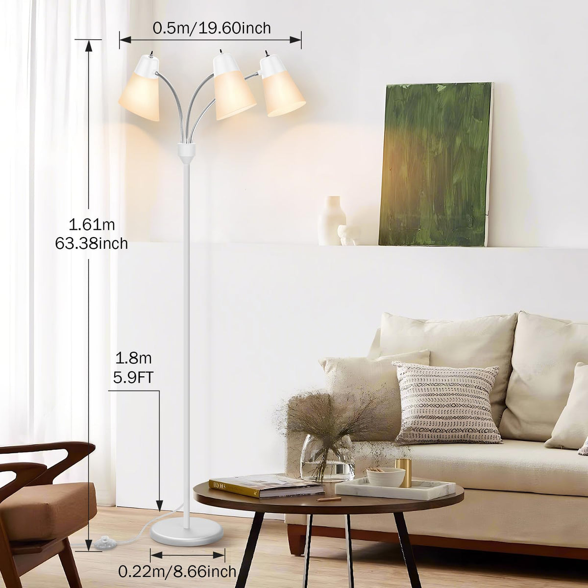 Folksmate Led Floor Lamp, Medusa 3 Head Modern Adjustable Gooseneck Tall Standing Light For Living/Kids Room, Bedroom, White