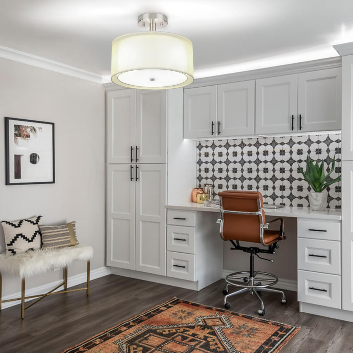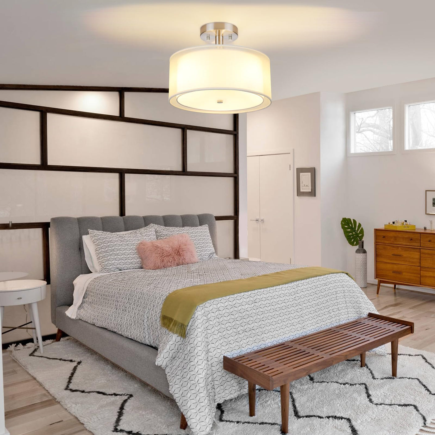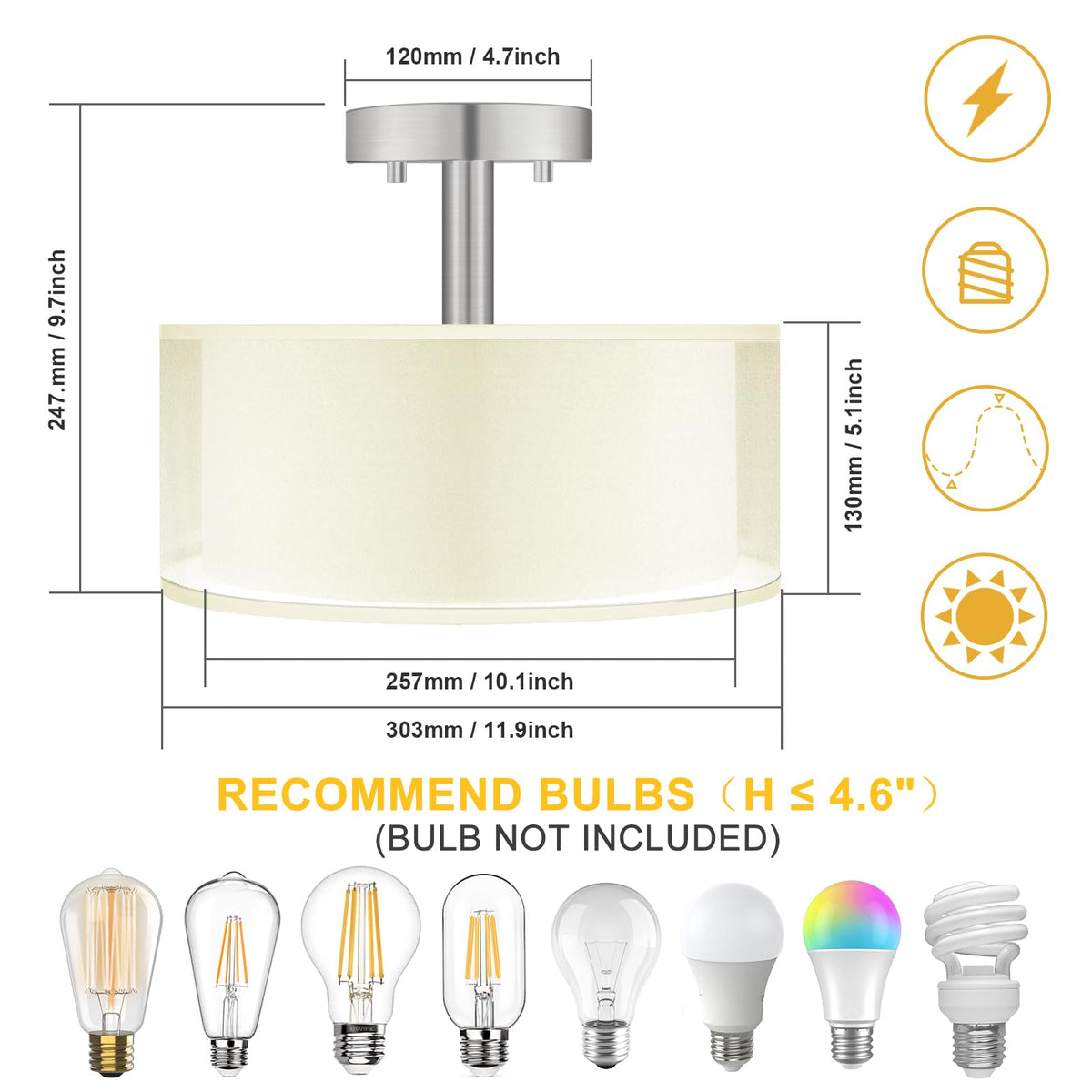 Brighten your space with the Folksmate 3-light semi flush mount light, an exceptional piece to add to any modern interior design. Crafted of metal in brushed nickel finish, it features a round canopy complete with decorative screw caps and a short length of the cylindrical body. Heavy-duty materials structured to ensure durability and functionality for maximum performance. The double fabric drum shade and sheet cover ensconce three standard E26 base bulbs (not included), perfectly diffuses the lighting to provide superior lighting distribution for any living space such as kitchen, living room, bedroom, hallway and more. Specification Input Voltage: 120V Frequency: Total 60W MAX Base: E26 Base Color: Gold Material: lron, Fabric Finish: Satin Nickel Dimension: W12*H9.7inch Easy to Install & Use 1. Attach the mounting strip to the junction box of the ceiling by using the mounting screws. 2. Connect the rod with the lamp body and canopy. 3. Connect the wires by using the wire connector. [Note: connect the black wire to the black (Hot)), the white (Neutral), and the ground wire to the ground post.] 4. Fix the canopy to the mounting strip, and lock it tight using the screws. 5. Insert the bulb. [Bulbs not included] 6. Lock the bottom board to the lamp body using the finial. Package Includes 1 X Semi Flush Mount Ceiling Light (Bulbs Not Included) 1 X Tool Kit (2 Screws & 3 Wire Connector) 1 X User Manual Note 1. If you don't know how to install it, please refer to a licensed electrician. 2.Make sure you have cut off the electricity supply before installation. 3.Do not connect electricity until your fixture is fully assembled. 4. Keep flammable materials away from light bulb. 5. Before replacing the light bulb, cut off the electricity supply and allow the bulb to cool.