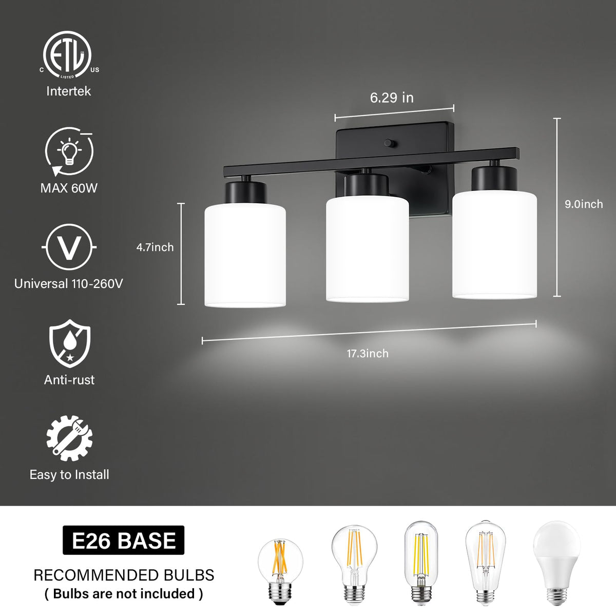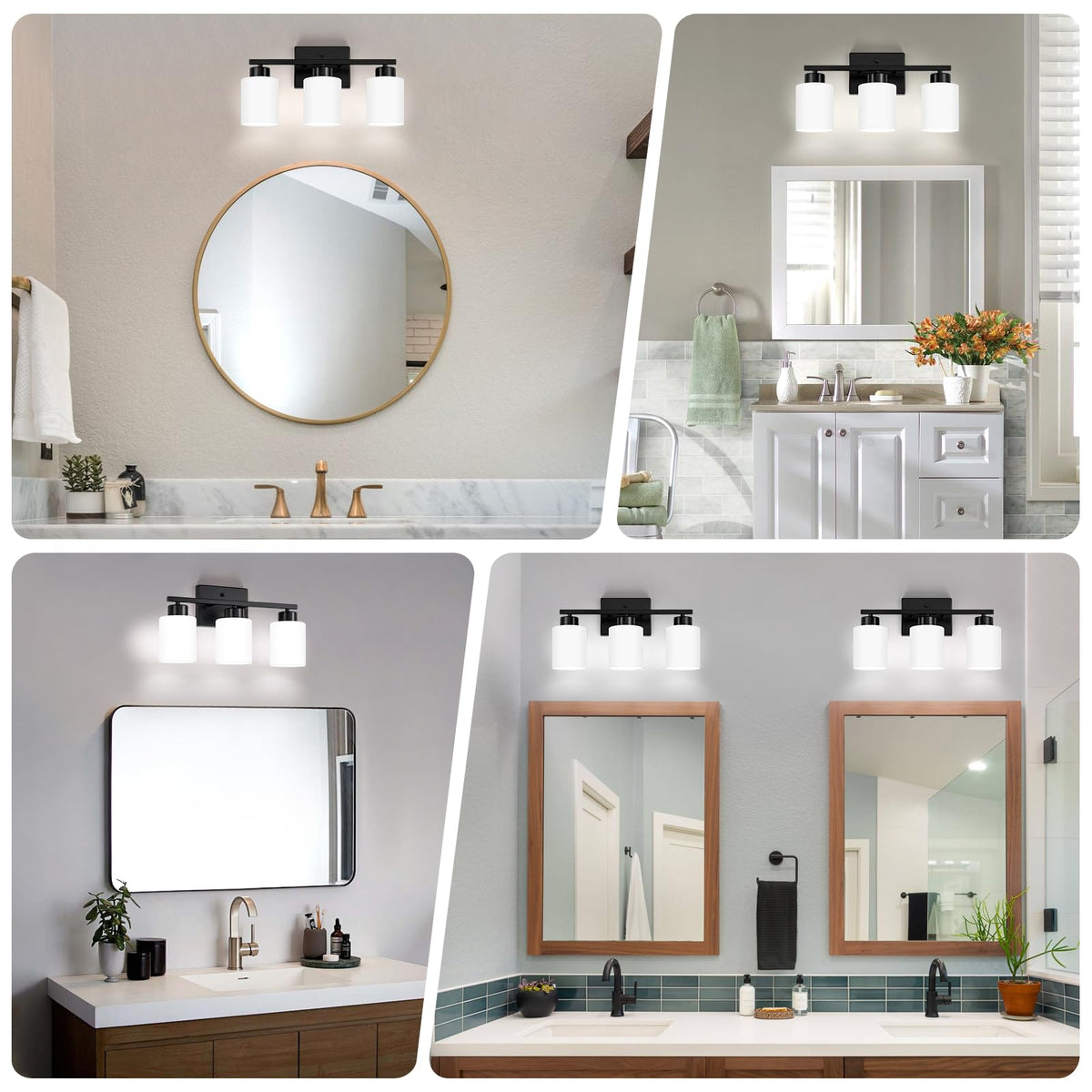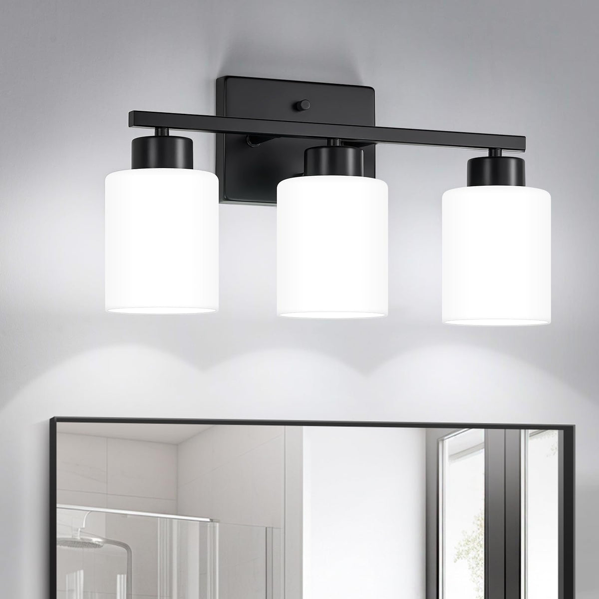 Fonmyim Black Bathroom Light Fixtures, 3-Light Modern Vanity Light Over Mirror, Wall Sconces With Milky White Frosted Glass Shad