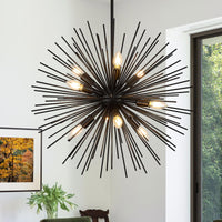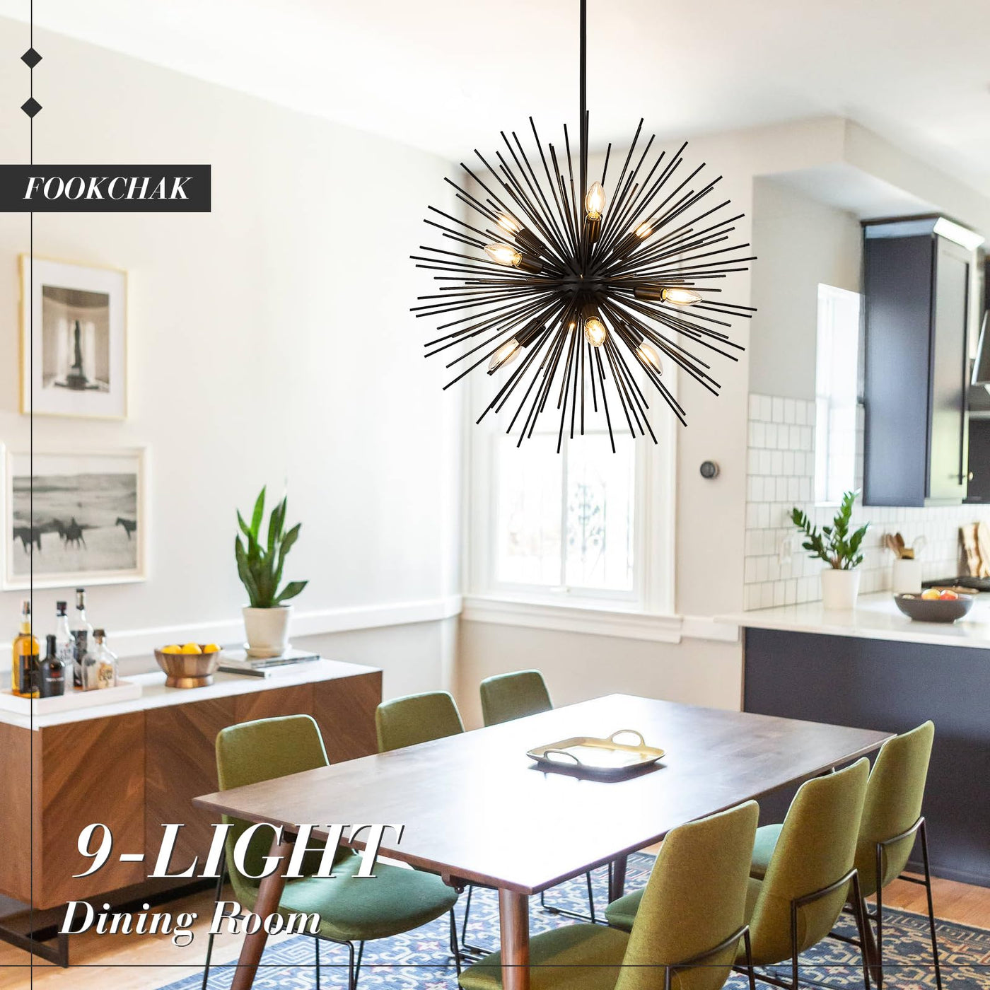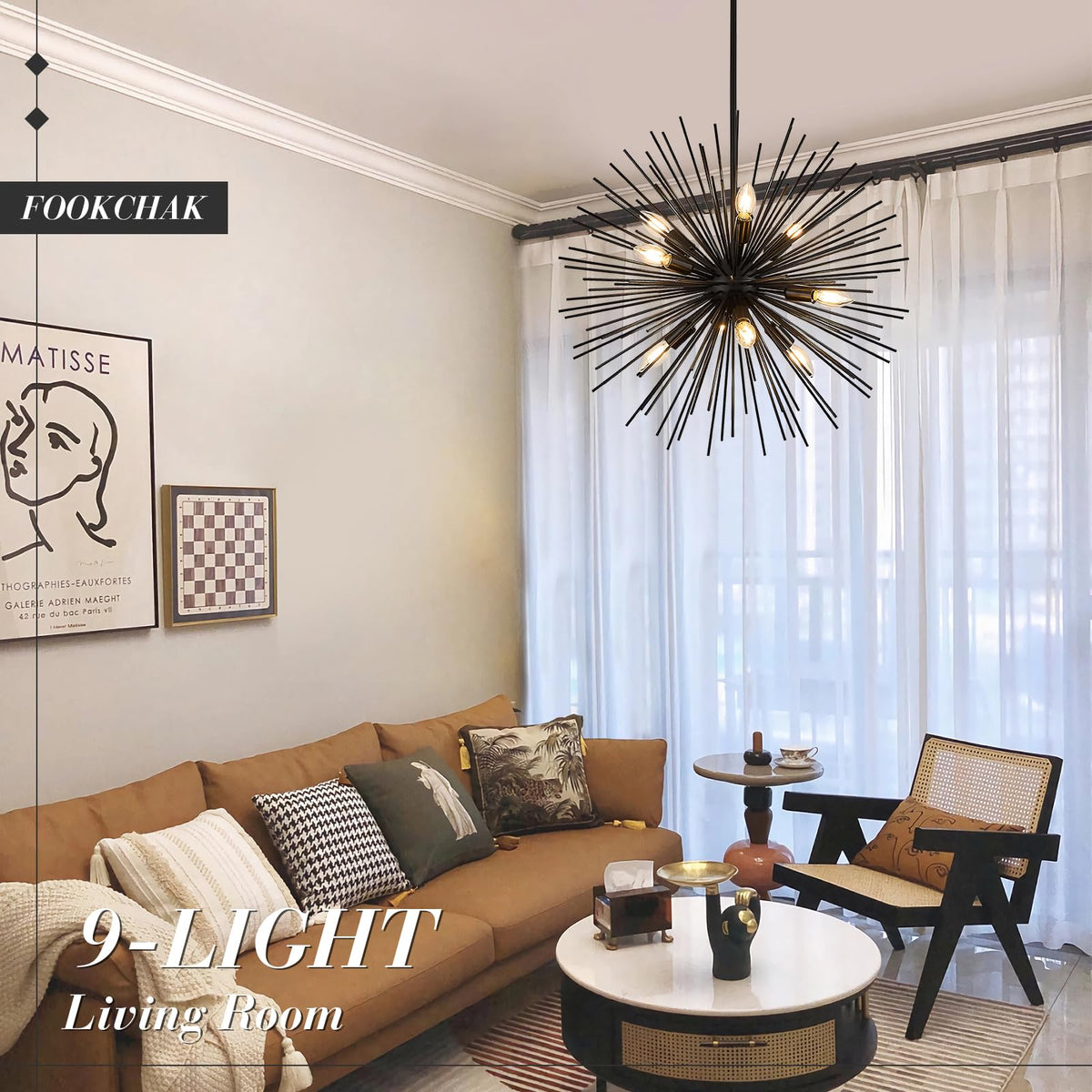 Fookchak 24In Black Sputnik Chandelier 9-Light Starburst Chandelier Light Fixture Solid Metal Mid-Century Modern Satellite Light