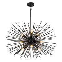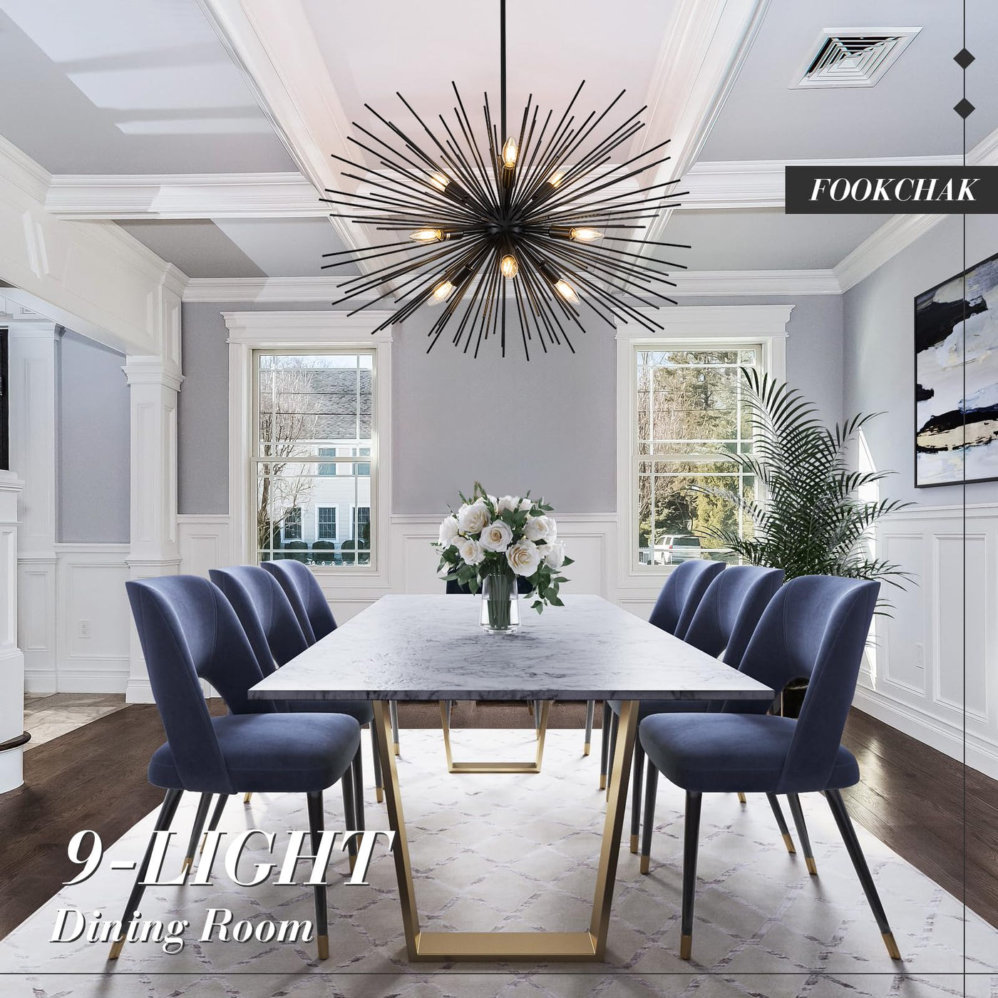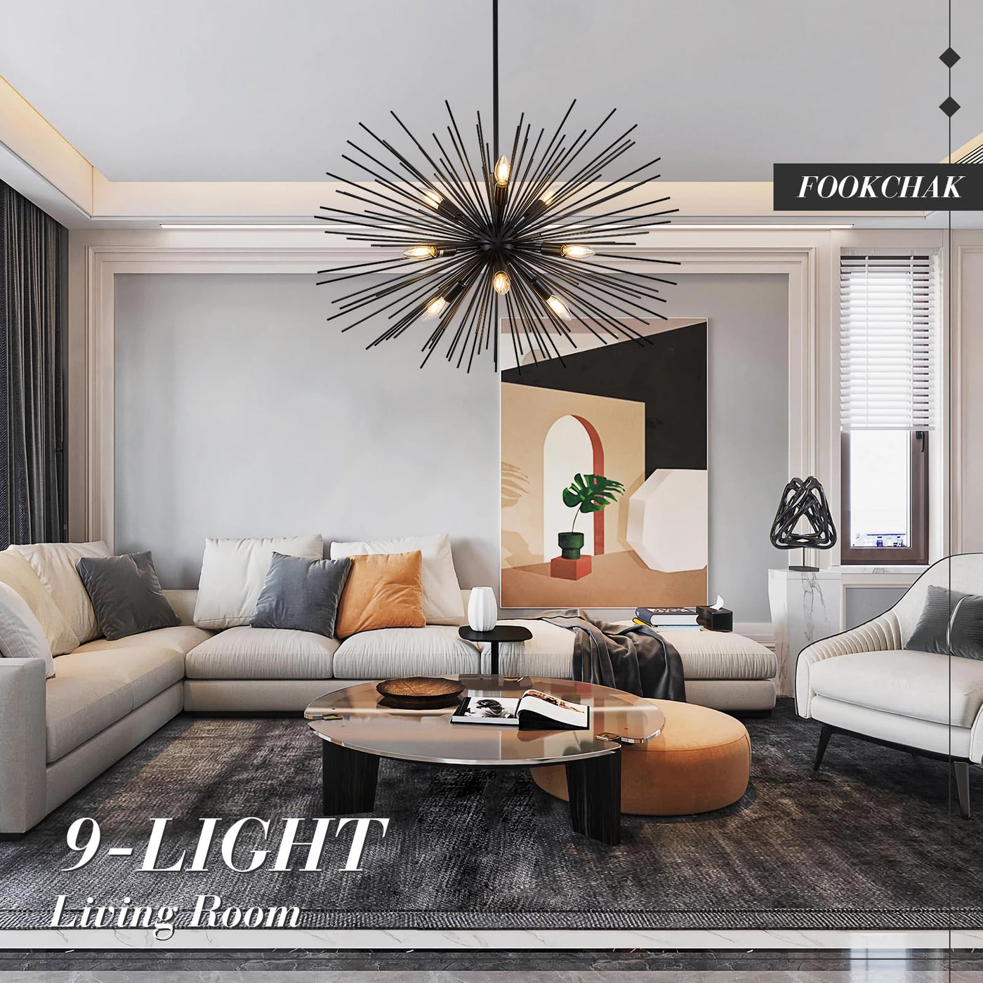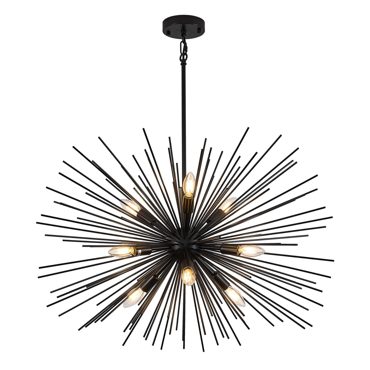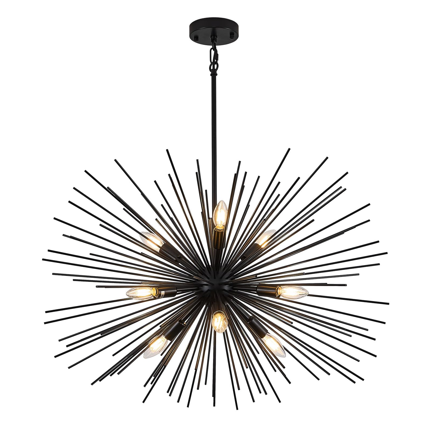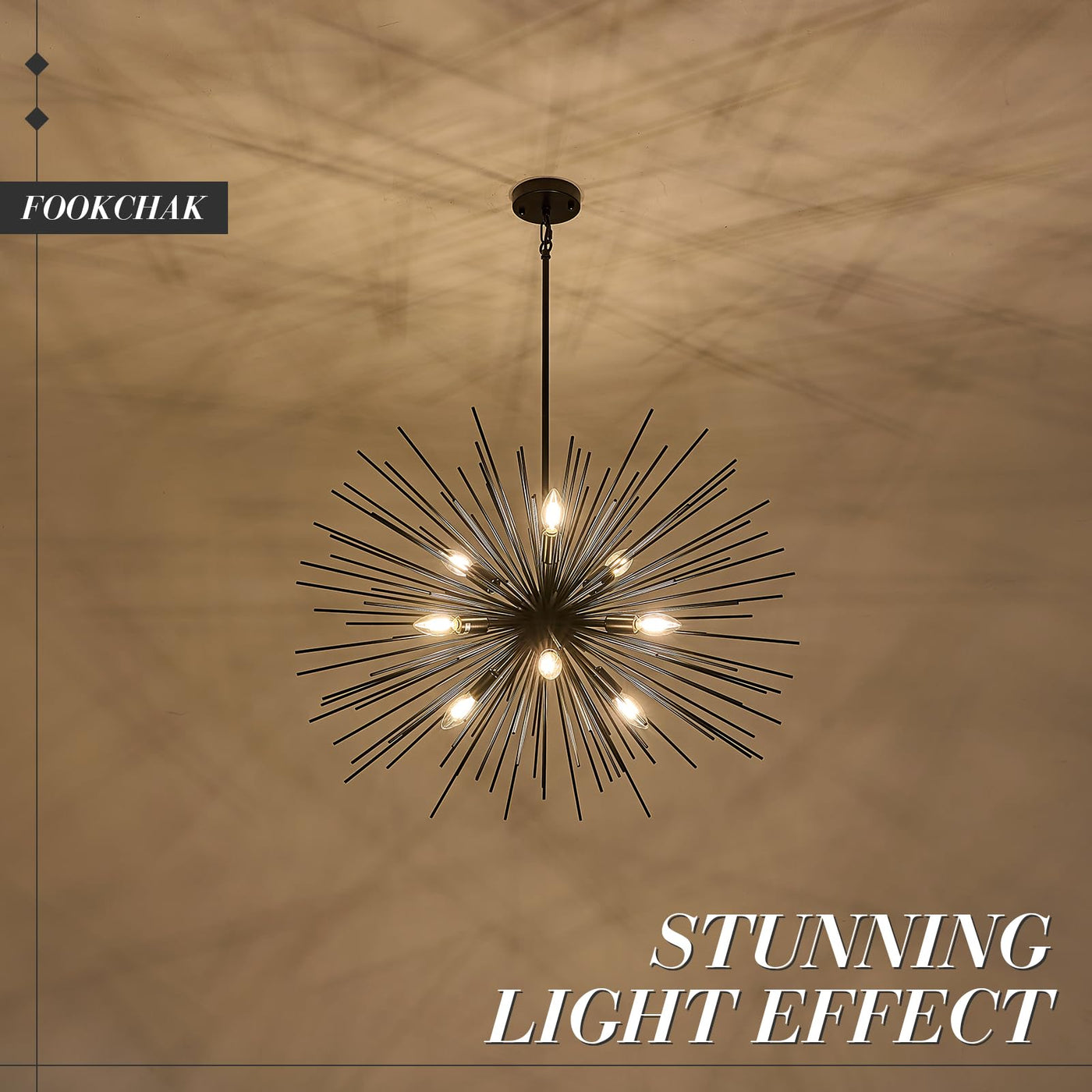 Fookchak 32In Black Sputnik Chandelier Solid Metal Starburst Chandelier Light Fixture 9-Light Mid-Century Modern Satellite Light