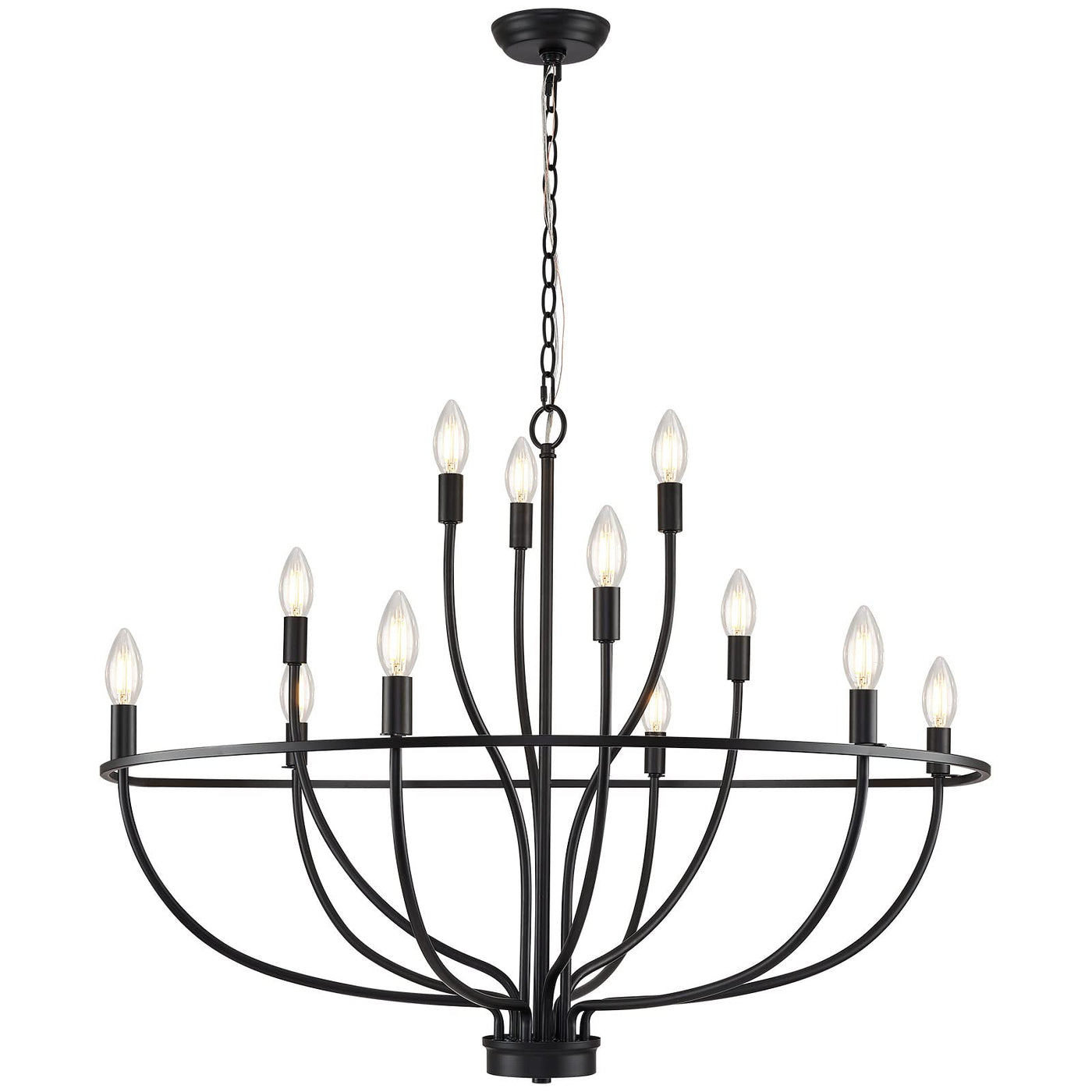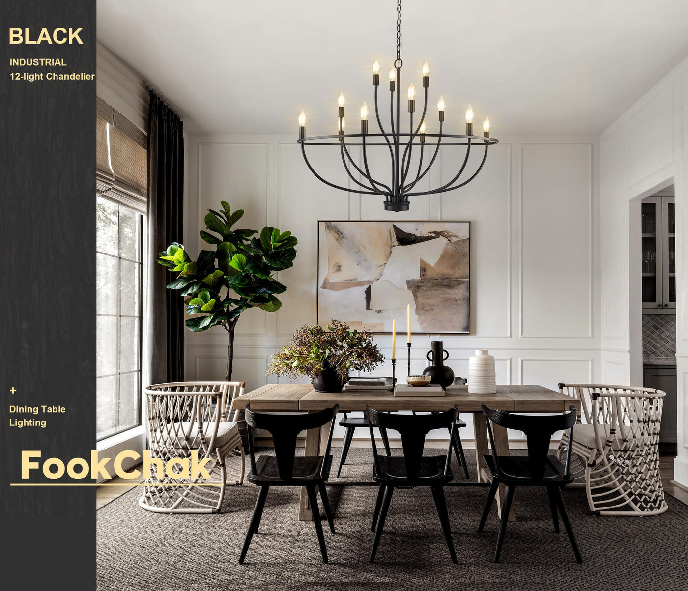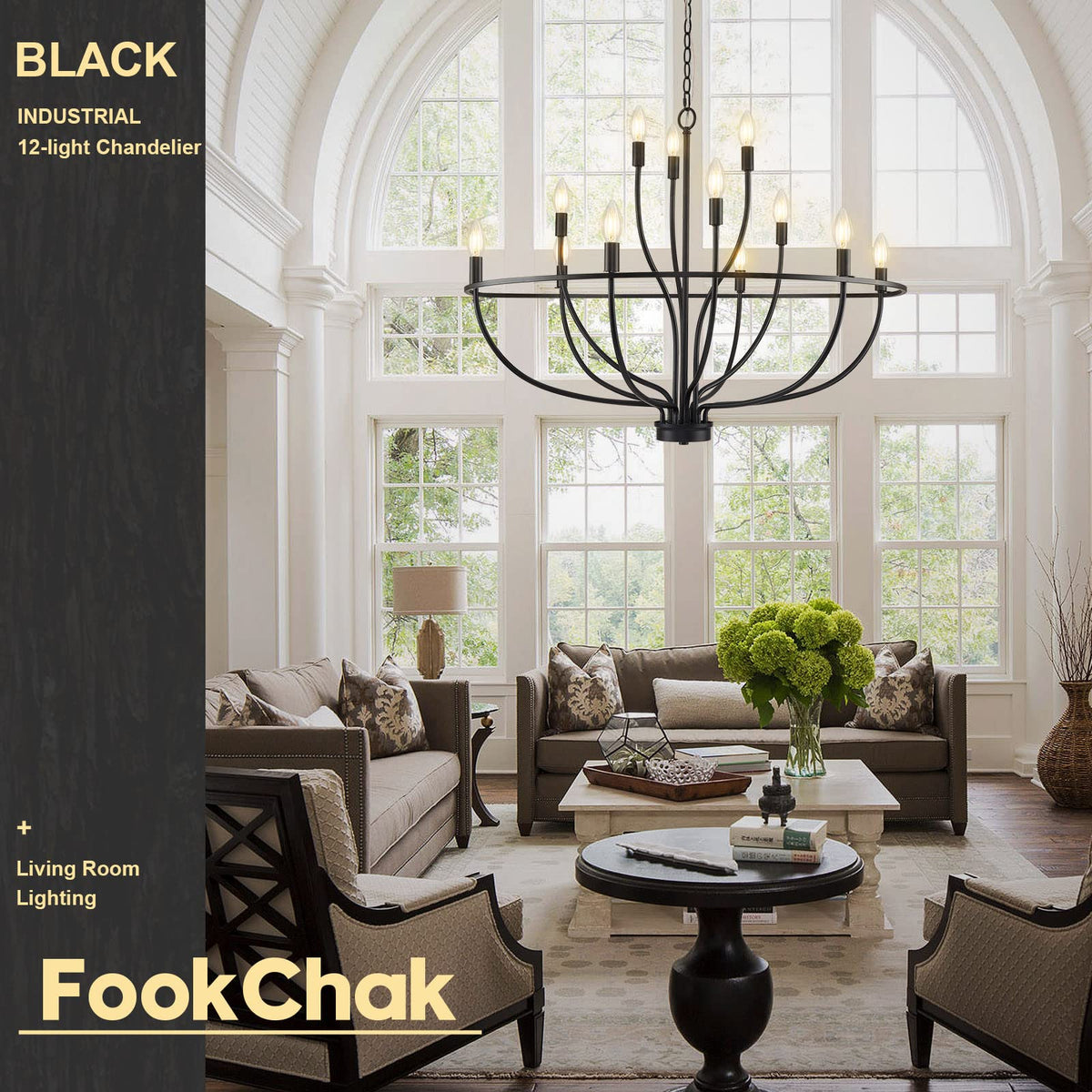 FookChak 12-light Black Candle Chandelier Light Fixture Features: FookChak black 12-light Candle Chandelier, 12 light socket, provides adequate lighting experience. Using anti-rust upgraded material, nice,functional and durable. Compatible with 12 X E12 Bulb, Max 60W. 36in(W) with 36''chain adjustable, available with sloped/vaulted ceiling(Canopy diameter:5in). An elegant and decent gift for birthday, housewarming,anniversary and Spring decoration remodeling. PRODUCT SPECIFICATION: Working Voltage: 120V Lamp Base: E12 Max Wattage: Max 60W Material: Metal Style: Industrial Product Weight: 11Lb WARM PROMPT: We recommend installation by a licensed professional electrician. To ensure your safety, be sure to disconnect the power supply before installation. Do not turn on the power until the device is fully assembled. To reduce the risk of fire, electric shock or personal injury, be sure to turn off the fixture to cool the bulb before replacing it. Package includes: 1 x FookChak 12-light Candle Chandelier Light Fixture(Industrial black) 1 x Assemble kits 1 x User Manual