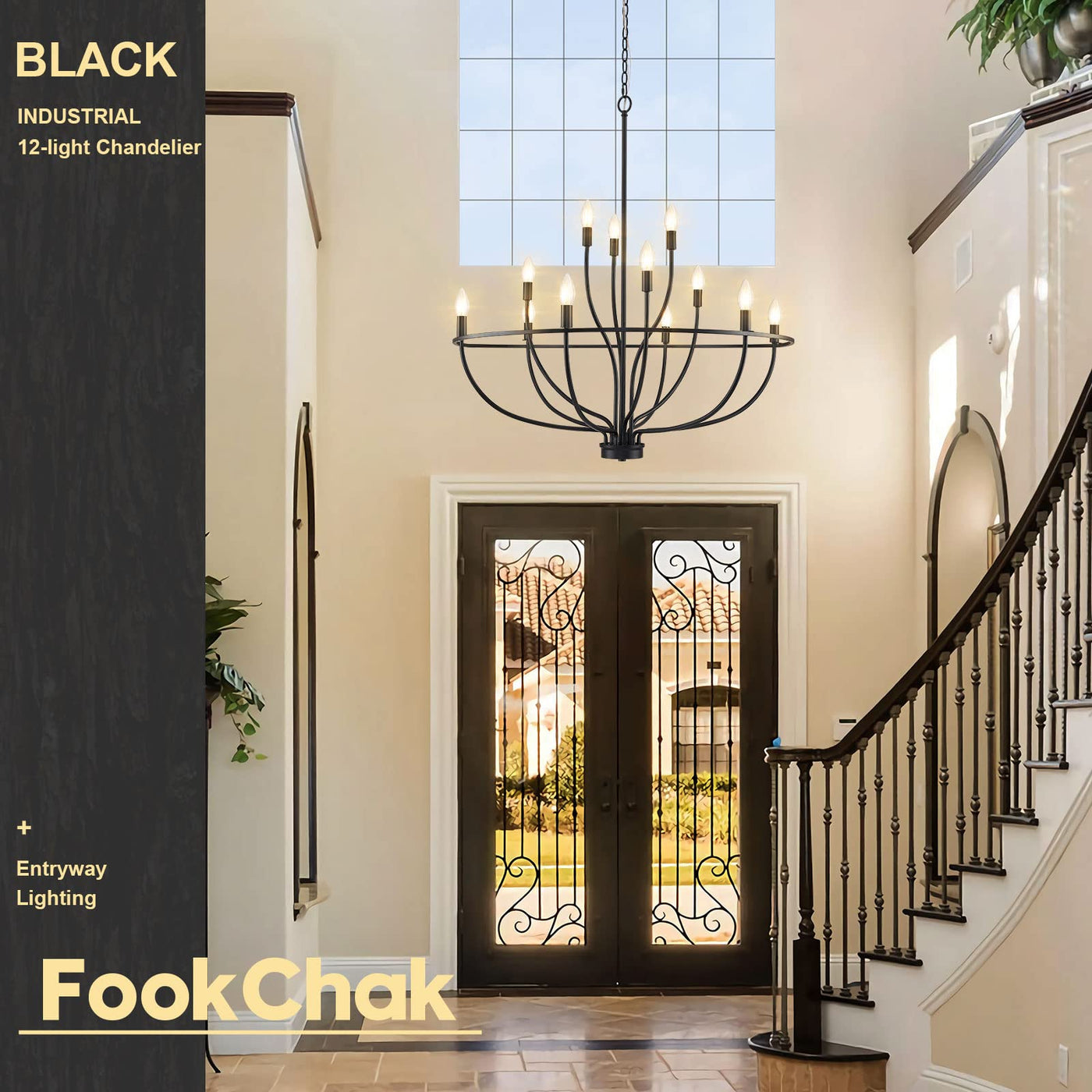 Fookchak Black Foyer Chandelier 12 Light Hallway Chandelier For Entryway High Ceiling Staircase Chandelier 36In Light Fixture Ch