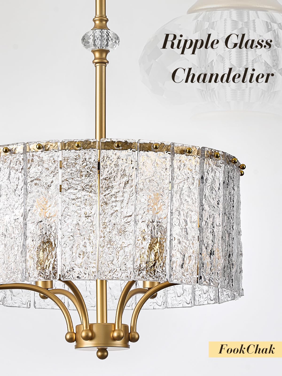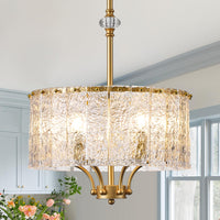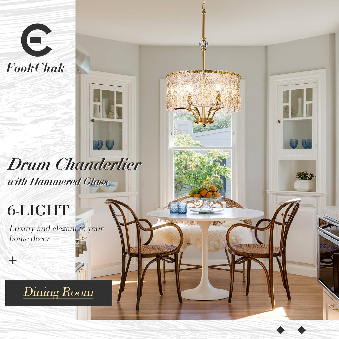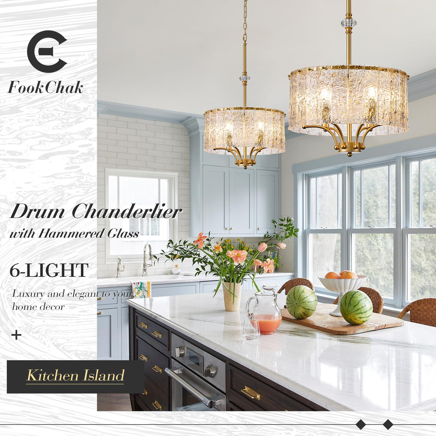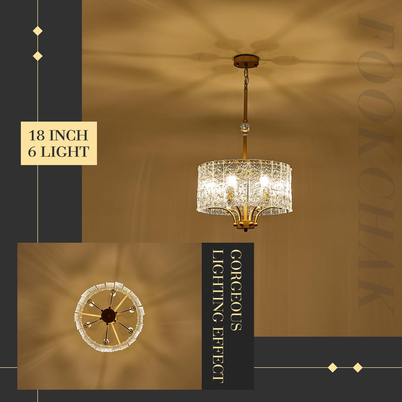 Fookchak Gold Round Chandelier 18In Glass Drum Chandelier Light Fixture 6-Light Hammered Crystal Ceiling Pendant Light For Kiche