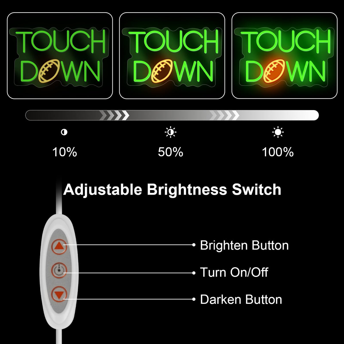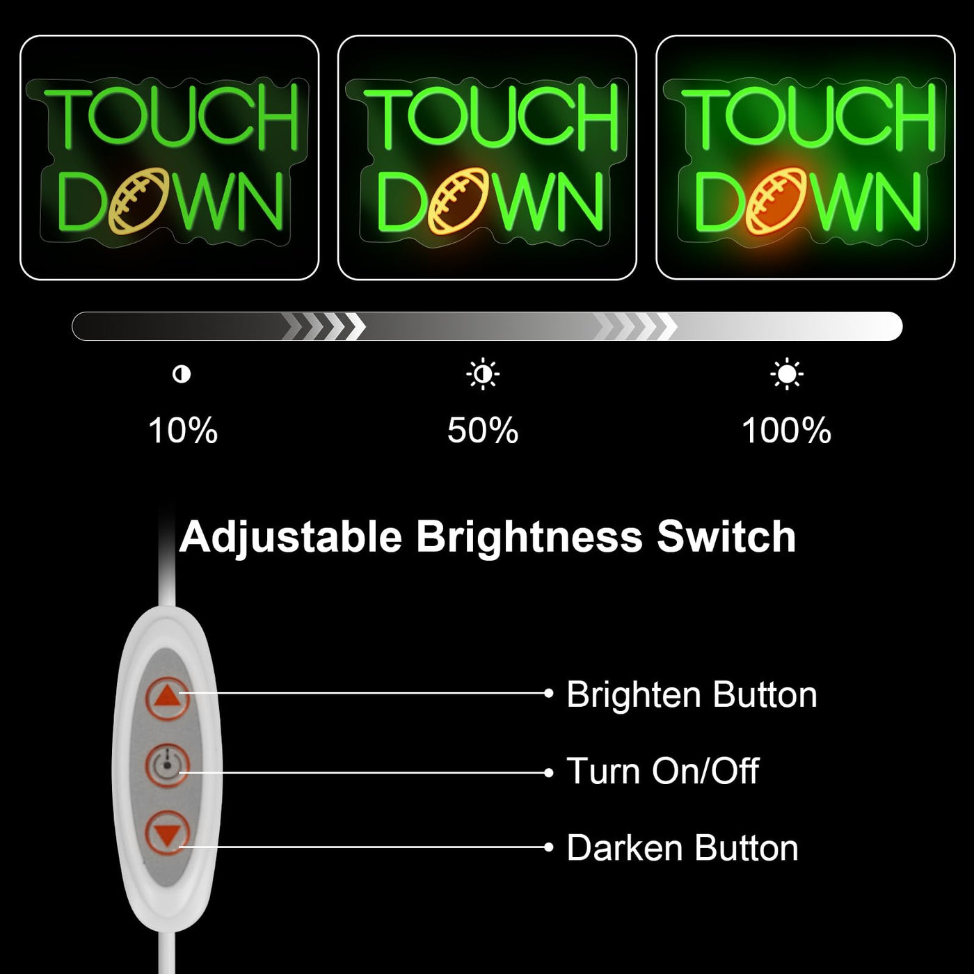 Q: Is the brightness adjustable on this neon sign?A: Yes, the Football Touch Down Neon Sign features a dimmable controller that allows you to adjust the brightness according to your preference, helping you set the perfect atmosphere for any occasion.