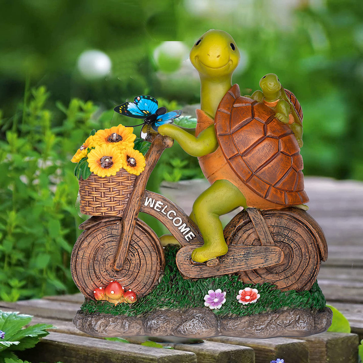 Q: How does the solar light work on the turtle statue?A: The solar light on the turtle statue is powered by a solar panel that charges during the day and automatically lights up at night, providing a charming glow to your garden without the need for wiring.