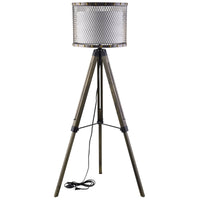Introducing the Fortune Floor Lamp, a symbol of liberation and abundance. This exquisite piece combines steel, fabric, and pine wood elements to create a harmonious blend of materials. The external mesh casing is crafted from iron-tinted solid steel, adorned with brass nails for an added touch of elegance. Inside, a cream-colored fabric drum shade emits a soft, inviting glow. The lamp stands tall on a sturdy tripod stand made of solid pine wood and black coated steel, adding a touch of creativity to any space. Perfect for rustic, ranch, vintage modern, industrial modern, and transitional dcors. This set includes 1 Fortune Floor Lamp.