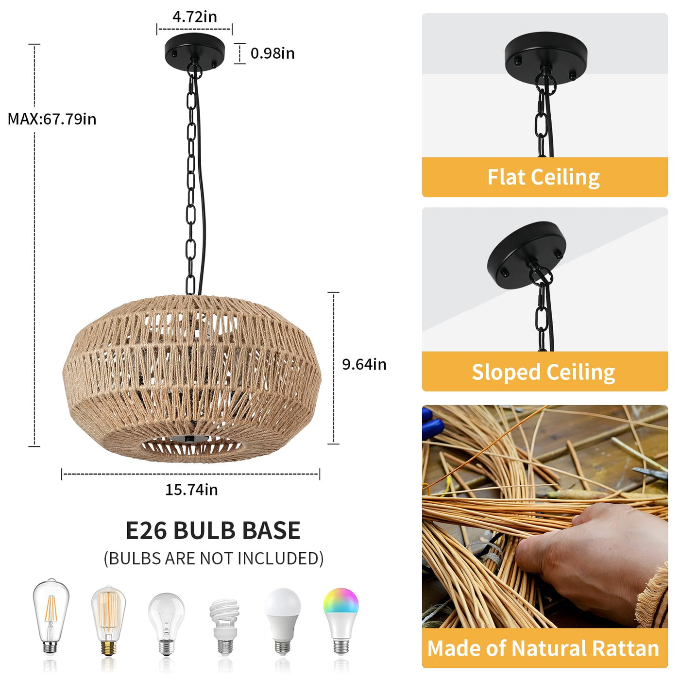 - **Height Adjustable & Versatile Use**: With an adjustable height range from 12.3" to 67.8", this rustic rattan chandelier can be adapted for both flat and sloping ceilings. Ideal for various settings, it’s perfect for brightening up bedrooms, living rooms, kitchen islands, or dining areas, adding a touch of charm and interest to your home.