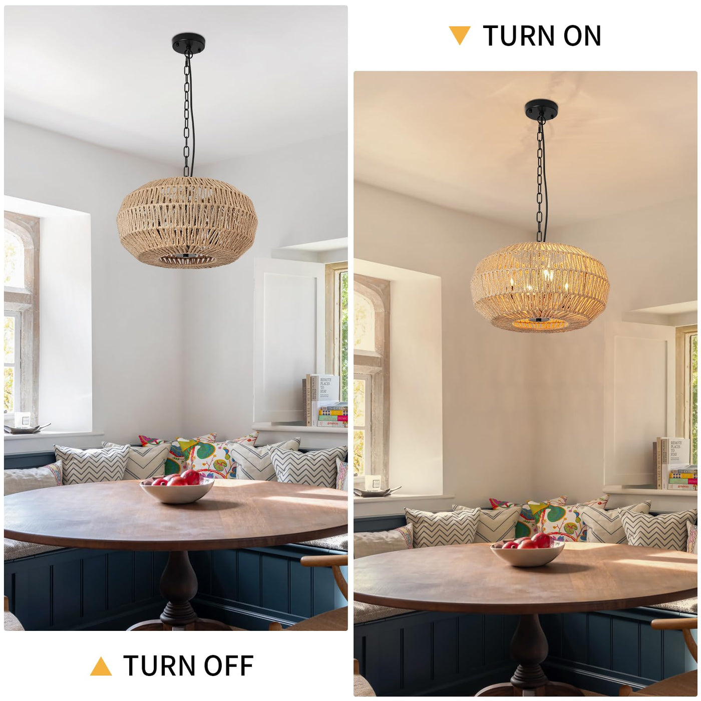 - **4-Light Large Farmhouse Chandelier**: Crafted from hand-woven natural rattan and durable metal, this chandelier not only provides a beautiful 360° light effect but also casts charming shadows through its artistic design, creating a cozy ambiance that enhances your bohemian-inspired decor.