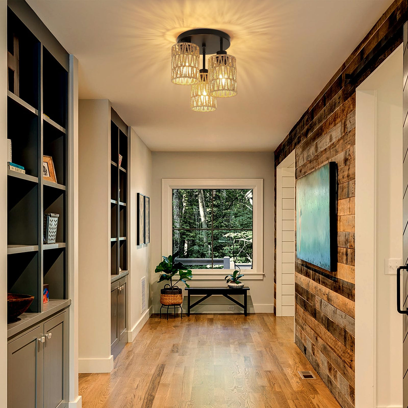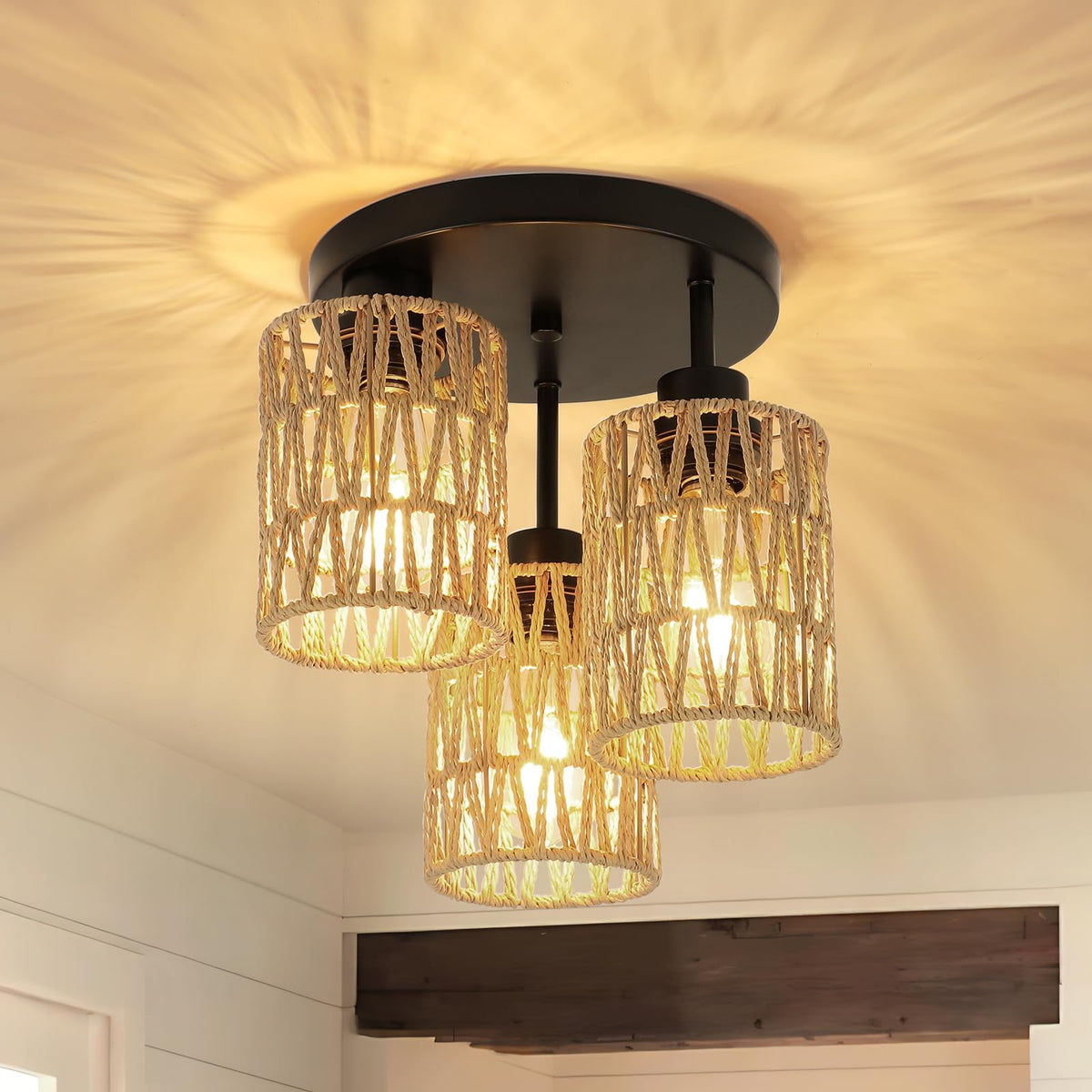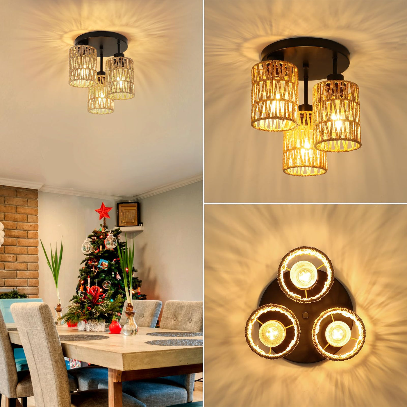 Foucasal Boho Light Fixtures Ceiling Mount, 3-Light Boho Flush Mount Ceiling Light, Rattan Woven Chandelier Lighting For Farmhou