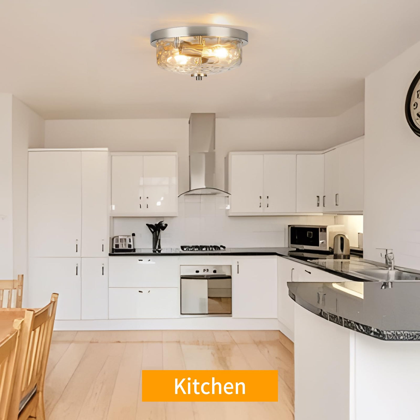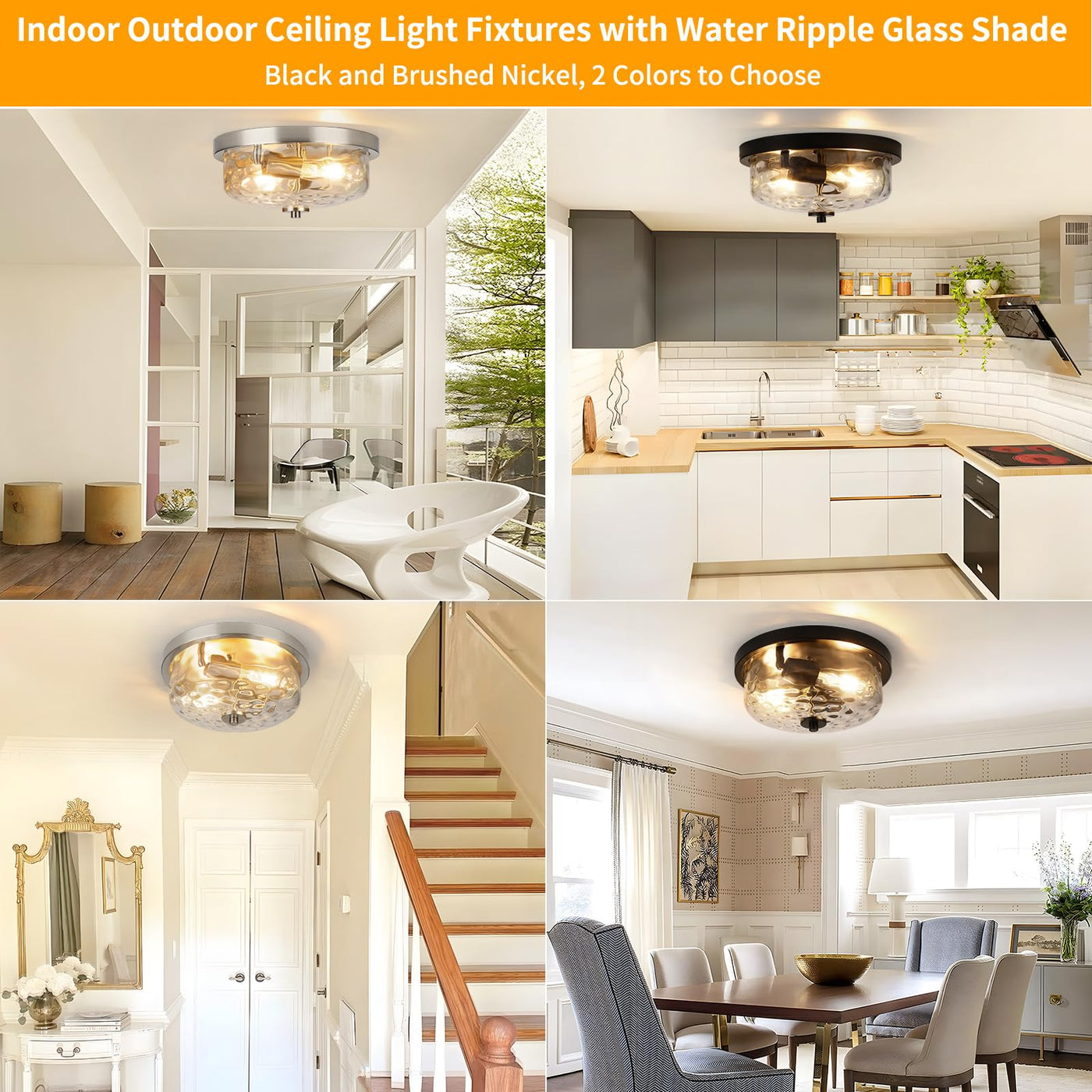 The modern brushed nickel ceiling light with heavy metal construction and water ripple glass shade, suitable for any environment, this truly versatile piece is weather resistant and can be placed outside or inside for a trend-setting look.