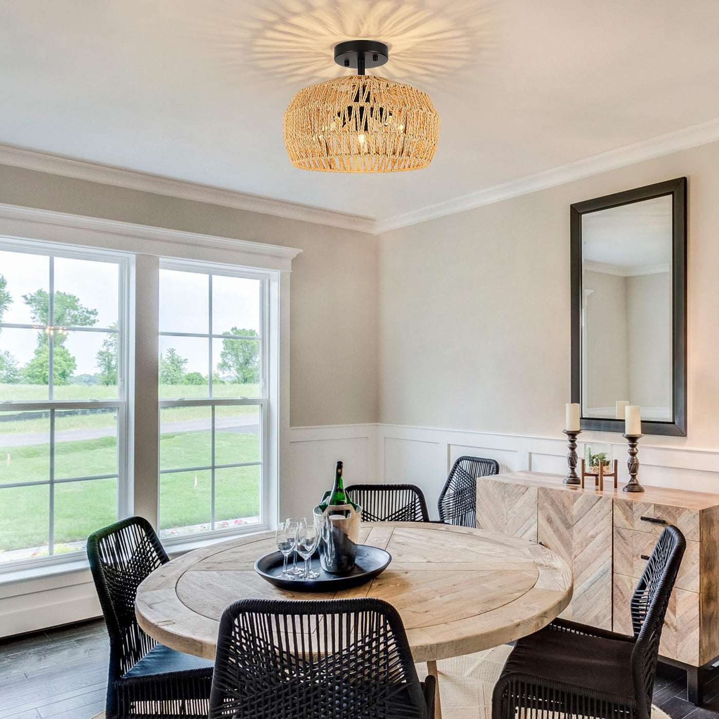 Q: What styles of home decor does this rattan ceiling lamp suit?A: The versatility of the foucasal Rattan Ceiling Lamp makes it suitable for various home decor styles, including coastal, bohemian, and rustic. It can enhance spaces such as bedrooms, hallways, nurseries, and kitchens.