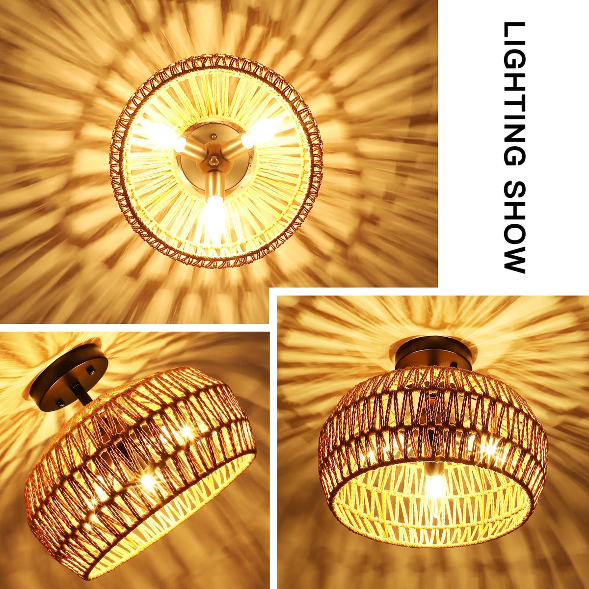 Q: What is the light effect produced by this ceiling fixture?A: The foucasal Rattan Ceiling Lamp provides a 360° light effect, casting beautiful shadows through the rattan holes and creating a cozy, soft glow when switched on, making it an elegant accent lighting choice.