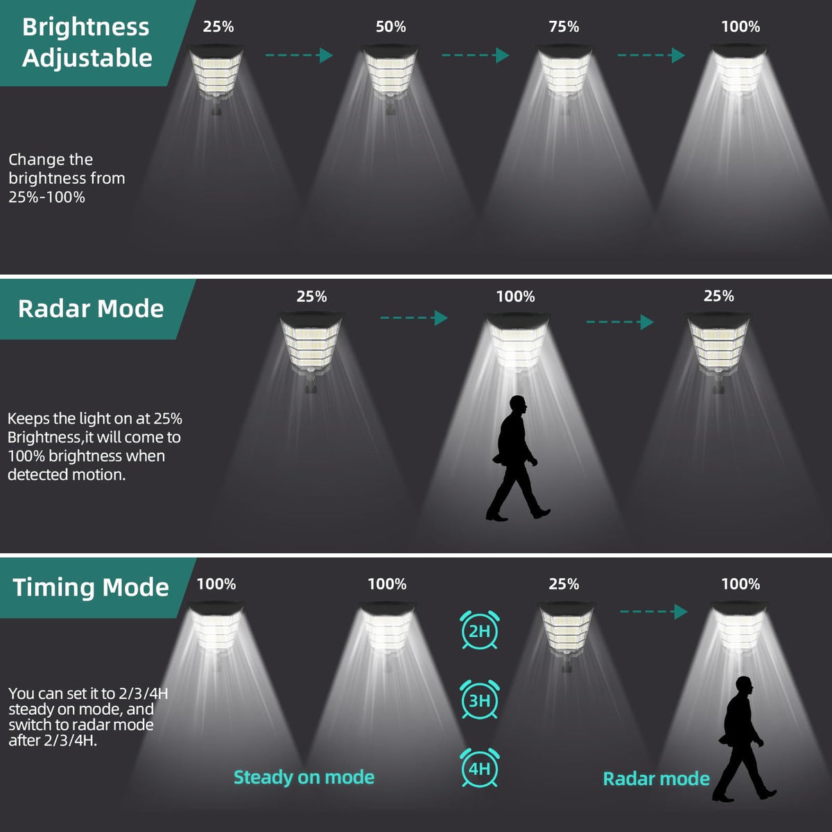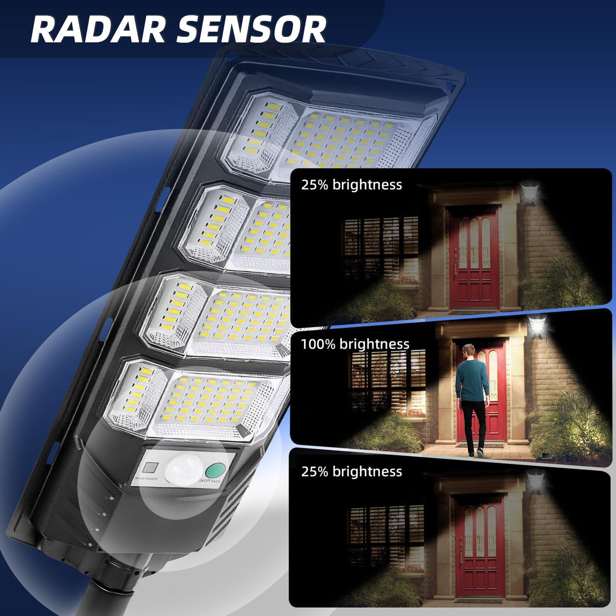 Q: What is the motion sensor feature in the FOWSEEK Solar Flood Light?A: The motion sensor feature detects movement nearby and automatically switches the light from a low mode to a high light mode, providing enhanced security and visibility when someone passes by.