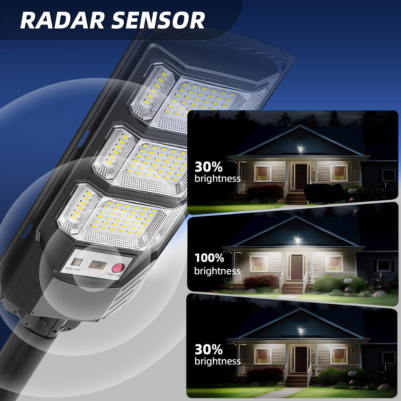 0 Electricity Bill: This solar street light doesn't need to be connected to the circuit, by converting sunlight into electricity to achieve power supply, 4000mAh large capacity solar panel, 12 hours of lighting is easily achieved. It means that you don't need to pay electricity bill. | Auto Charging & Lighting: The flood light adopts the integrated design of solar panels and LED lights, and charges the street light when it senses the light, and it will automatically light up at night, without manually opening. | Motion Sensor Outdoor Lights: FOWSEEK solar street lights outdoor are equipped with motion sensing devices, and when someone passes by or senses a moving object, the street lights will automatically change from a light mode to a high light mode, which provides you with a safer environment. | Bright 5730SMD LED Beads: This solar flood light is equipped with 144pcs 5730SMD beads, It is larger than the 2835 lamp bead and provides 3-4 times the brightness of the 2835 lamp bead; It has the characteristics of energy saving, long service life, and no radiation of infrared and ultraviolet rays. | IP67 Waterproof Performance: Solar lights outdoor waterproof are made of durable ABS plastic and monocrystalline silicon solar panel, IP67 waterproof ensures the outdoor light fixture can function well even in heavy rain, snowstorms. | Easy to install: solar outdoor lights provide screw accessories and manual, simple installation, only need to be fixed with screws, no wiring. Suitable for all kinds of outdoor areas such as courtyards, gardens, streets, gates.
