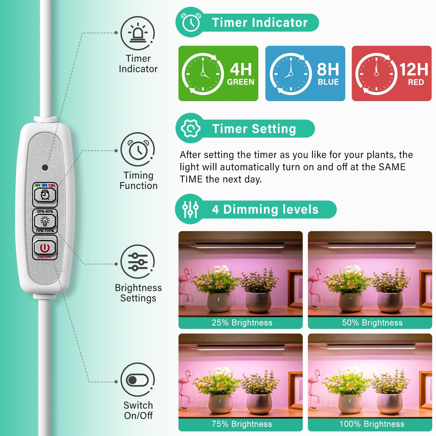 Q: How do I set the timer and adjust the brightness on the grow light strip?A: The grow light strip features a smart controller that allows you to choose from three timing options (4, 8, or 12 hours) and four dimming levels. Simply adjust the settings according to your plant's requirements for optimal growth.