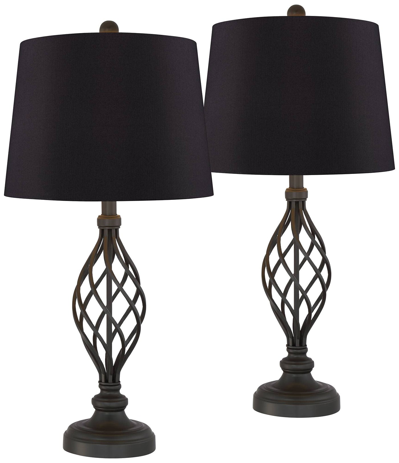 Q: What is the material used for the lamp's construction?A: The lamps are made of metal with a bronze finish, featuring an open lattice design and complemented by black faux silk drum shades.