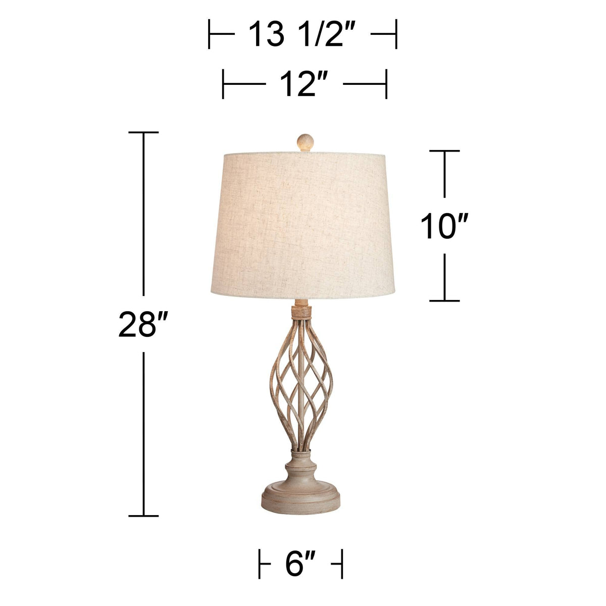 Q: What are the dimensions of the Franklin Iron Works Annie Table Lamps?A: Each lamp in the set stands 28 inches tall, with a base width of 6 inches. The tapered drum shades measure 12 inches across the top, 13.5 inches across the bottom, and are 10 inches high.