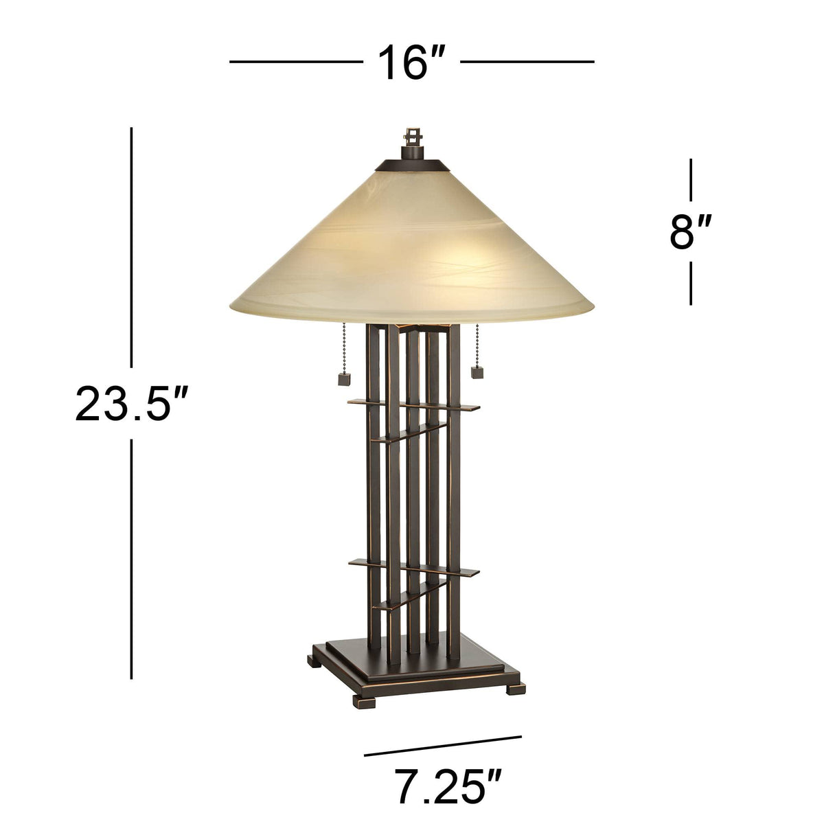 The Mission-Style Geometric Five Post Base Of This Lamp By 360 Lighting Is Very Unique And Optically Engaging. The Interlocking Posts Create A Fun, Optical Effect. The Cone Shaped Art Glass Shade Gives This Table Warmth And Classic Beauty. Dual Pull Chains With Square Finials.