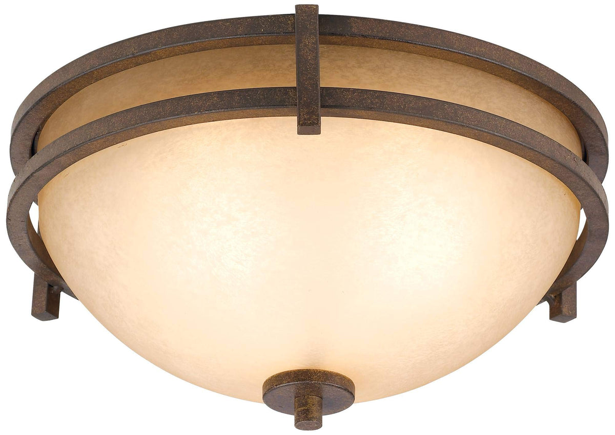 Q: What color options are available for this light fixture?A: The Franklin Iron Works flush mount light features a rustic bronze finish, complemented by a cream scavo glass bowl.