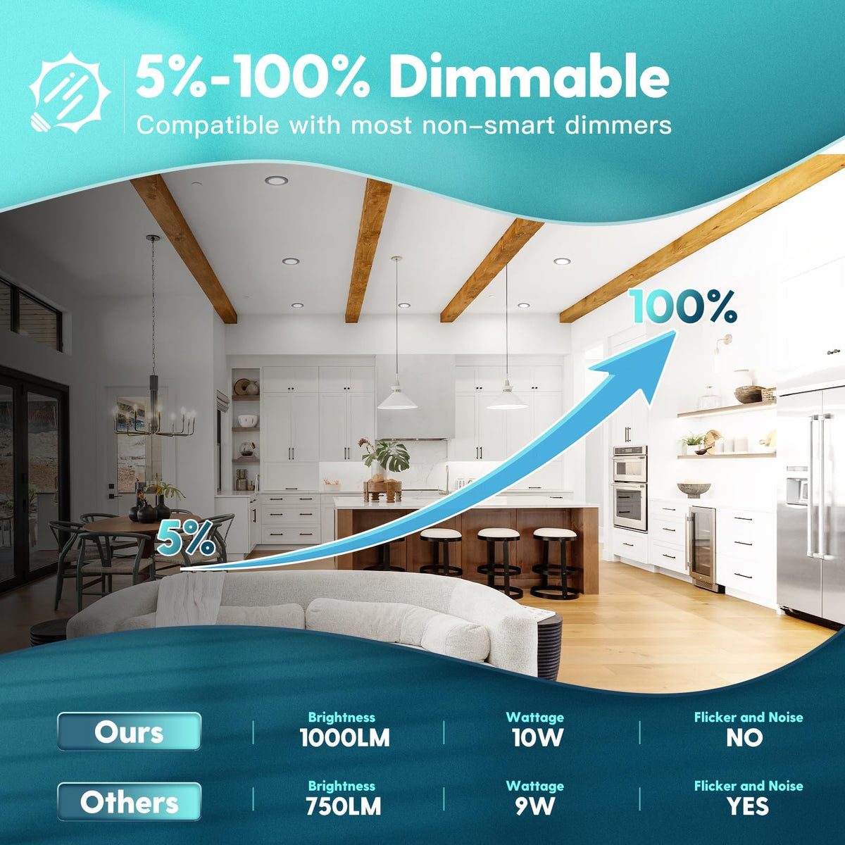 Q: How bright are these LED recessed lights?A: Each 6-inch LED can light produces 1000 lumens while consuming only 10 watts of power, equivalent to a 110-watt halogen lamp. This high brightness level ensures excellent illumination while saving up to 90% on energy costs.