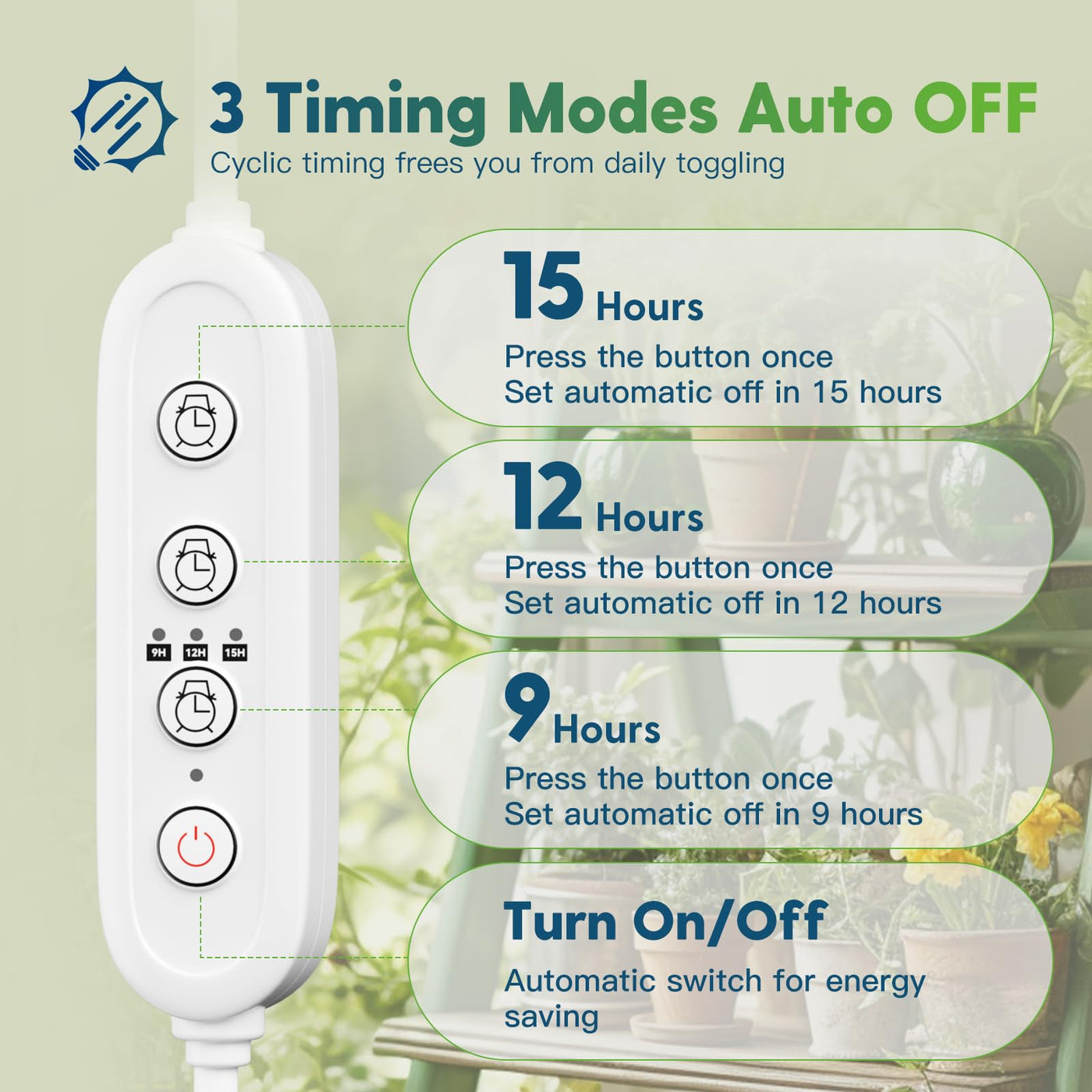 - **3 Timing Modes**: Enjoy effortless plant care with three convenient timer settings (9H, 12H, 15H). Set your preferred schedule with a simple click, ensuring your plants receive the right amount of light even when you're away.