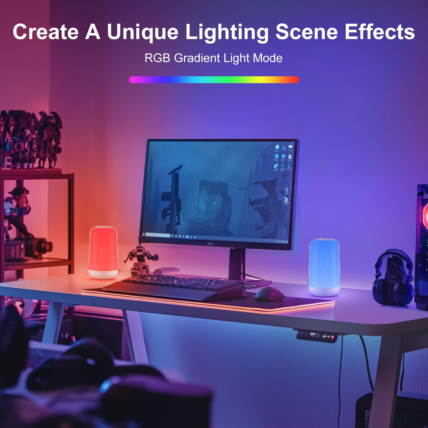 Q: What is the design of the Frideko RGB Touch Bedside Lamp like?A: The lamp has a sleek and compact design measuring 3.5” x 3.82” x 6.69” and weighs 0.95lbs. Its non-slip base ensures stability, and the modern white finish allows it to blend seamlessly with any room decor.