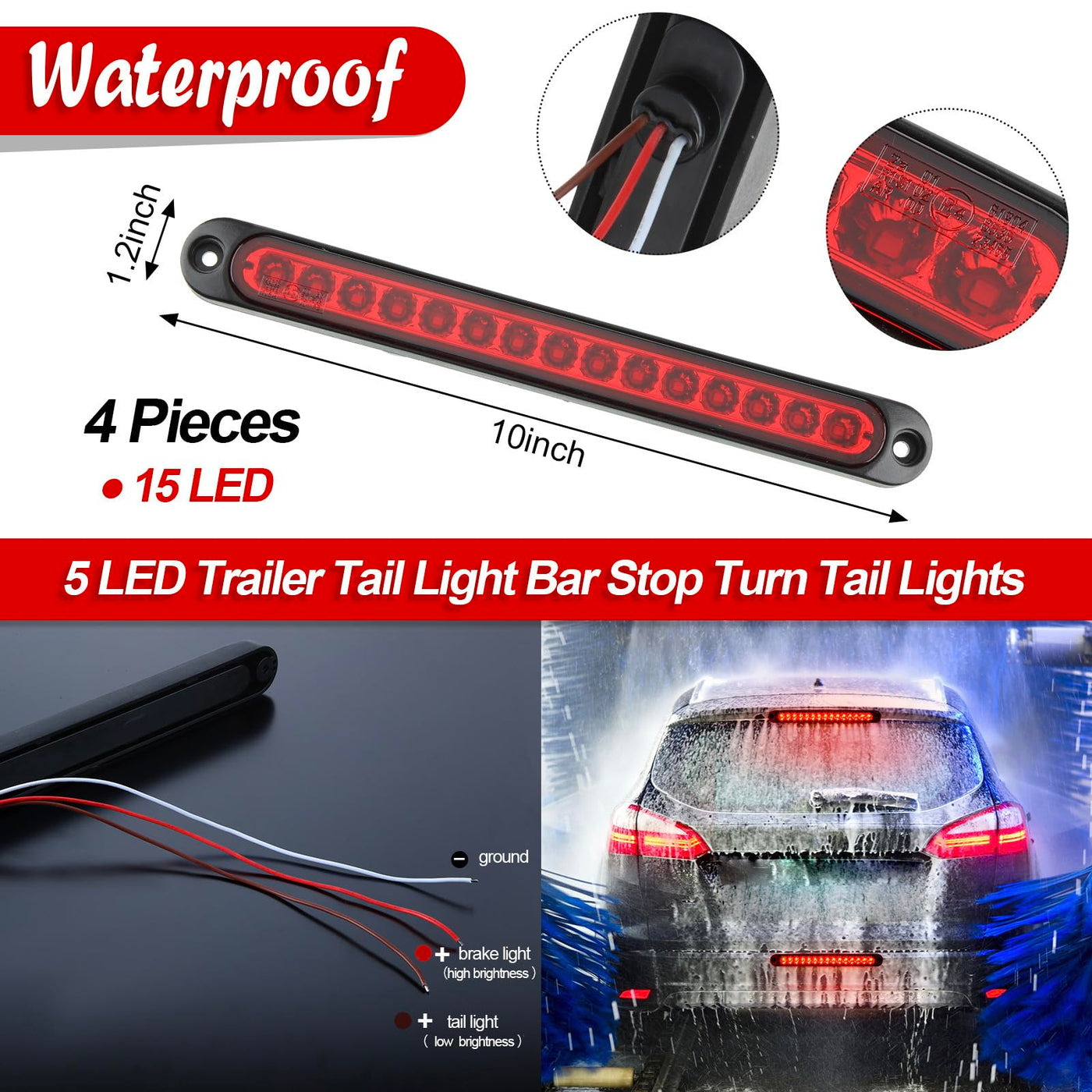 Features:IP 67 waterproof design:The shells of these turn trailer tail lights are waterproof and dust-proof, which can protect the LED lamp from the impact of sand and rain, so even in rainy days or other bad weather, you can use them with confidence. Long-term use:These waterproof trailer light bars are durable and solid, and they are also quality and wear-resistant, and they have enough brightness, they can accompany you for a long time.Specifications:Material: plastic, LED lights, wiresColor: redSize: 10 x 1.2 inchPackage includes:4 x LED trailer tail lightsNote:Manual measurement, please allow slight errors on size.The color may exist slight difference due to different screen display.