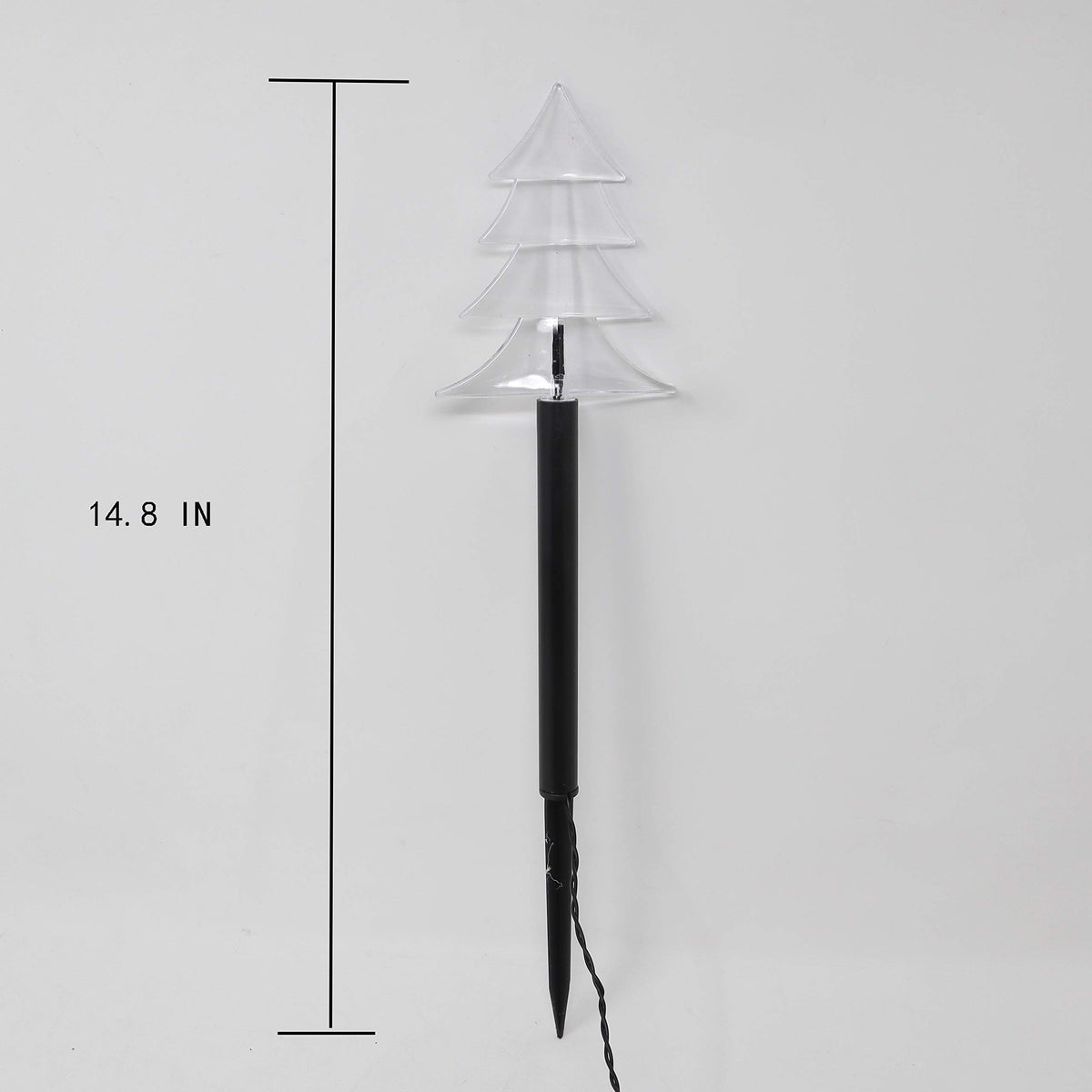 Christmas Led Garden Pathway Lights. With these cute Christmas Garden Lights, you can decorate an illuminated pathway in your garden. This collection is inspired by popular Christmas elements: Snowflakes, Stars and Christmas trees. The holiday landscape lights are made of high transparency material and premium led lights. With classic warm white light, it can be great decorative lighting for patio, yard, lawn, driveway or walkway. The light and the battery case are rain tight so no worry about the rainy and small snowy day outside. 3 AA batteries are required (not included). The built-in 6 hours timer will keep light on for 6 hours and then 18 hours off, repeat everyday. Dimensions: Height of single light: 14.8 in; Wire between sticks: 13.8 in; Leading: 19.7 in. Total length: 6.2 Ft.