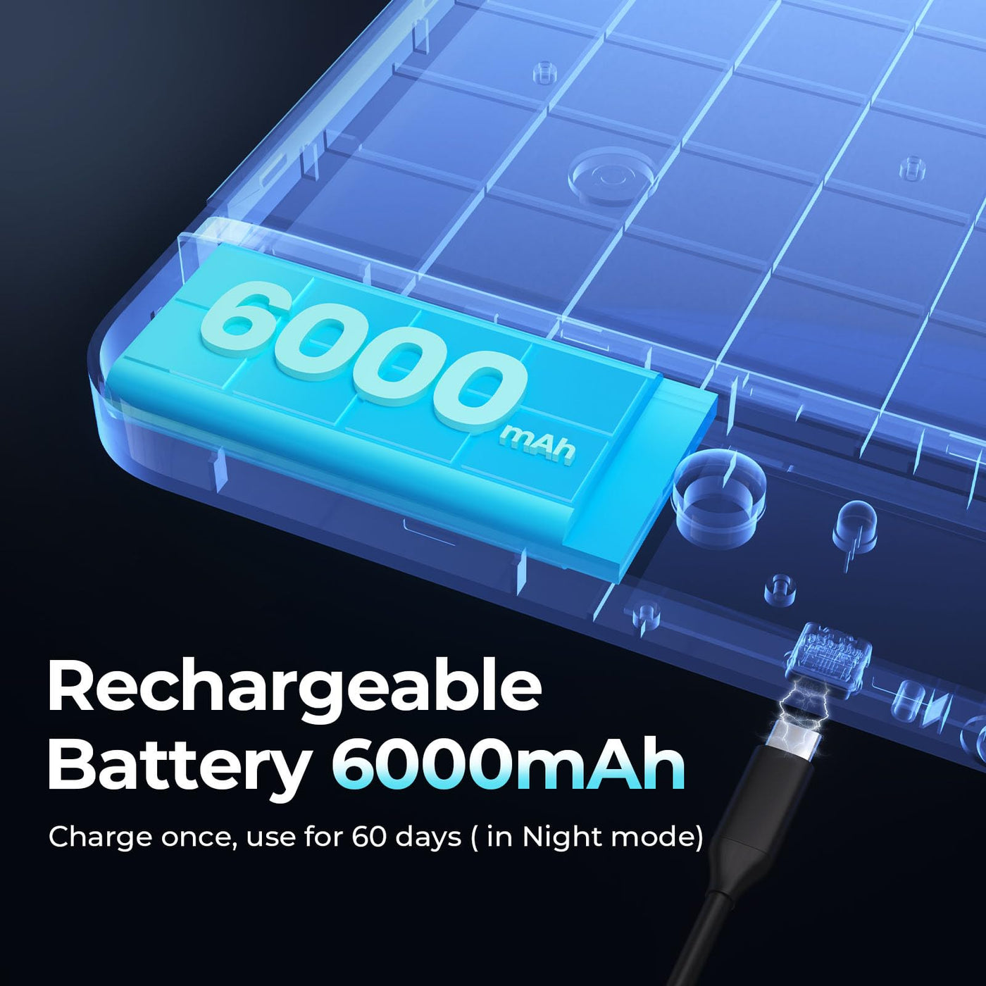Upgraded Rechargeable Battery: Features a 6000mAh battery that eliminates the need for disposable batteries, fully charging in 5-6 hours for over a month of use in motion sensing mode and 10 hours in steady mode.