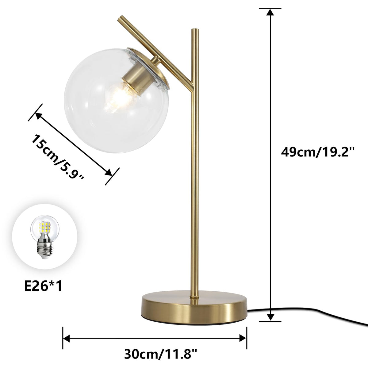 Q: What are the dimensions of the Fulesi Mid Century Modern Table Lamp?A: The overall dimensions of the lamp are height 19.2 inches (49 cm) and width 11.8 inches (30 cm), with a glass globe diameter of 5.9 inches (15 cm), making it an ideal size for bedside or study tables.