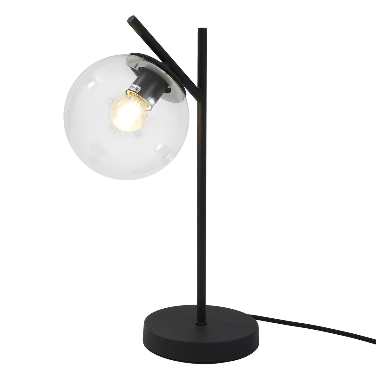 This table lamp features a sleek design with a sturdy metal and glass construction. The black finish adds a touch of sophistication, while the glass globe diffuses light softly, creating a warm and inviting atmosphere. The lamp is suitable for various settings, including bedrooms, living rooms, and study areas, enhancing your space with both functionality and style.