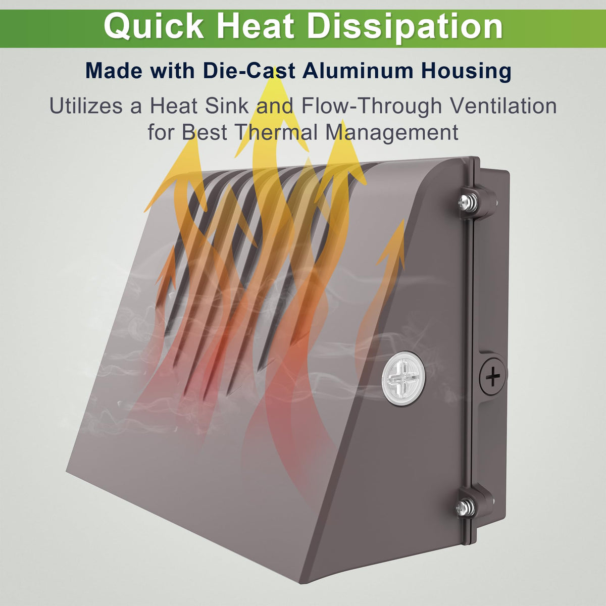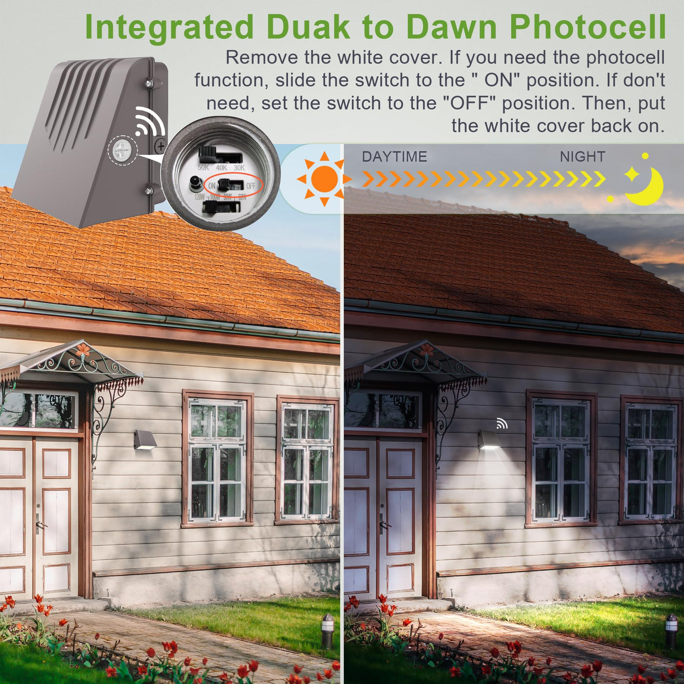 This Full Cut Off LED Wall Pack Light offers adjustable power options (60W, 90W, 100W, 120W) and selectable color temperatures (3000K, 4000K, 5000K) to suit a variety of outdoor lighting needs, from industrial warehouses to street lighting, Equipped with a built-in photocell sensor, this LED wall pack automatically turns on at dusk and off at dawn, offering energy-efficient operation for outdoor areas, reducing energy waste when the light is not needed.